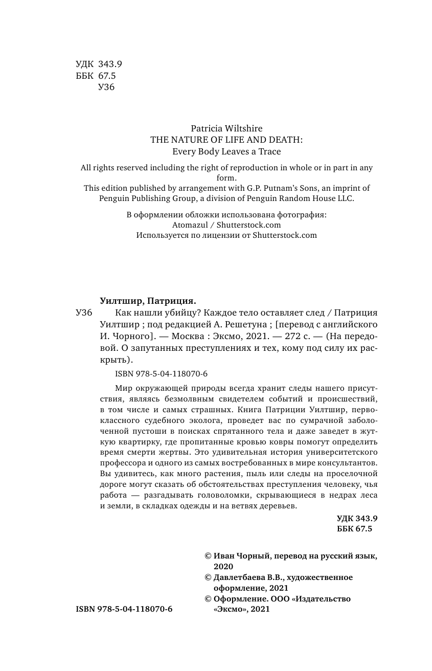 Мир окружающей природы всегда хранит следы нашего присутствия, являясь безмолвным свидетелем событий и происшествий, в том числе и самых страшных. Книга Патриции Уилтшир, первоклассного судебного эколога, проведет вас по сумрачной заболоченной пустоши в поисках спрятанного тела и даже заведет в жуткую квартирку, где пропитанные кровью ковры помогут определить время смерти жертвы. Это удивительная история университетского профессора и одного из самых востребованных в мире консультантов. Вы удивитесь, как много растения, пыль или следы на проселочной дороге могут сказать об обстоятельствах преступления человеку, чья работа - разгадывать головоломки, скрывающиеся в недрах леса и земли, в складках одежды и на ветвях деревьев.