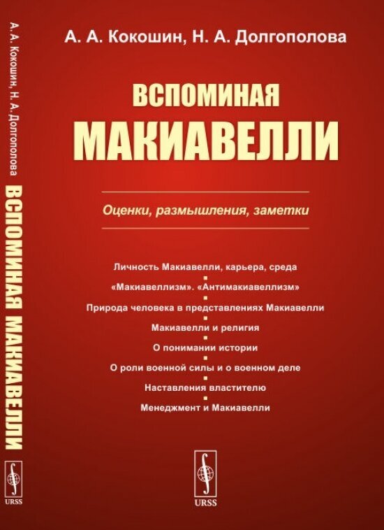 Академик РАН, в прошлом секретарь Совета безопасности России А.А. Кокошин и кандидат исторических наук Н.А. Долгополова избрали героем своей книги знаменитого итальянского мыслителя Никколо Макиавелли из Флоренции, 550-летие со дня рождения которого мир отмечал в 2019 г. Авторы сфокусировали внимание на политических трудах Макиавелли, значении главных направлений его творческого наследия, многие из которых рассмотрены не только в ретроспективе, но и в контексте современности. Привлечены переведенные на русский язык сочинения самого мыслителя, а также посвященные флорентийцу сочинения отечественных и зарубежных ученых. Последнее придает работе черты историографического исследования. Работа может оказаться полезной для читателей, интересующихся не только личностью Макиавелли и его взглядами, но и в целом базовыми вопросами политологии, включая представления о природе власти и сущности политики. Книга может быть использована в качестве материала в учебном процессе в высших учебных заведениях исторического и политологического профиля.