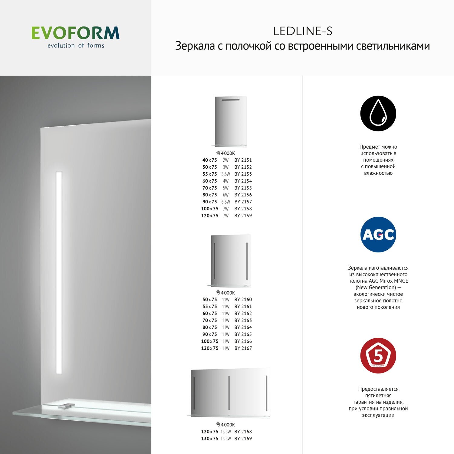Такое зеркало — это универсальное решение для интерьера ванной комнаты. К полотну изделия прикручена стеклянная полка, на которой вы сможете расположить зубные щётки, пасту и другие средства ежедневной гигиены. Дополнительная светодиодная подсветка имеет ряд преимуществ: экономично использует энергию; не содержит в составе и не выделяет вредные химические вещества, поэтому безопасна для человека; устойчива к перепадам напряжения и прослужит несколько лет. Большое зеркальное полотно имеет широкий угол отражения и визуально расширяет пространство помещения. Полированная кромка изделия уменьшает вероятность образования трещин, сколов и предохраняет владельца от порезов. Вы сможете расположить зеркало на стене с помощью крепления типа «винт-костыль». Производитель предоставляет 5 лет гарантии при условии правильной эксплуатации.