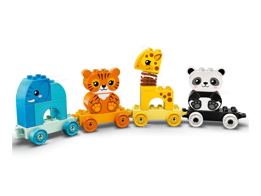 Все дети любят животных, верно? Набор «Мой первый поезд для зверей» Lego® Duplo® (10955) станет для малыша идеальным способом познакомиться с животным миром. Юного любителя природы ждут слон, тигр, жираф и панда. В процессе игры дети смогут собирать и пересобирать вагоны, сцеплять их, размещать животных, снимать их с поезда и ставить одно на другое. При этом они развивают мелкую моторику и открывают для себя мир творческих ролевых игр. Такие функции, как подвижная шея жирафа, добавляют радости веселой развивающей игрушке. Карточки с изображениями моделей в натуральную величину позволяют собирать их, прикладывая кубики к картинке, а чтобы было еще веселее, поезд можно соединить с другими игрушками DUPLO на колесах.