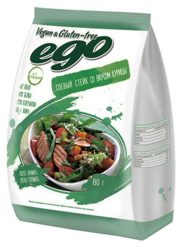Полуфабрикат сухой соевый "Ego" "Соевый стейк со вкусом курицы". Подходит для рационального питания здоровых людей.