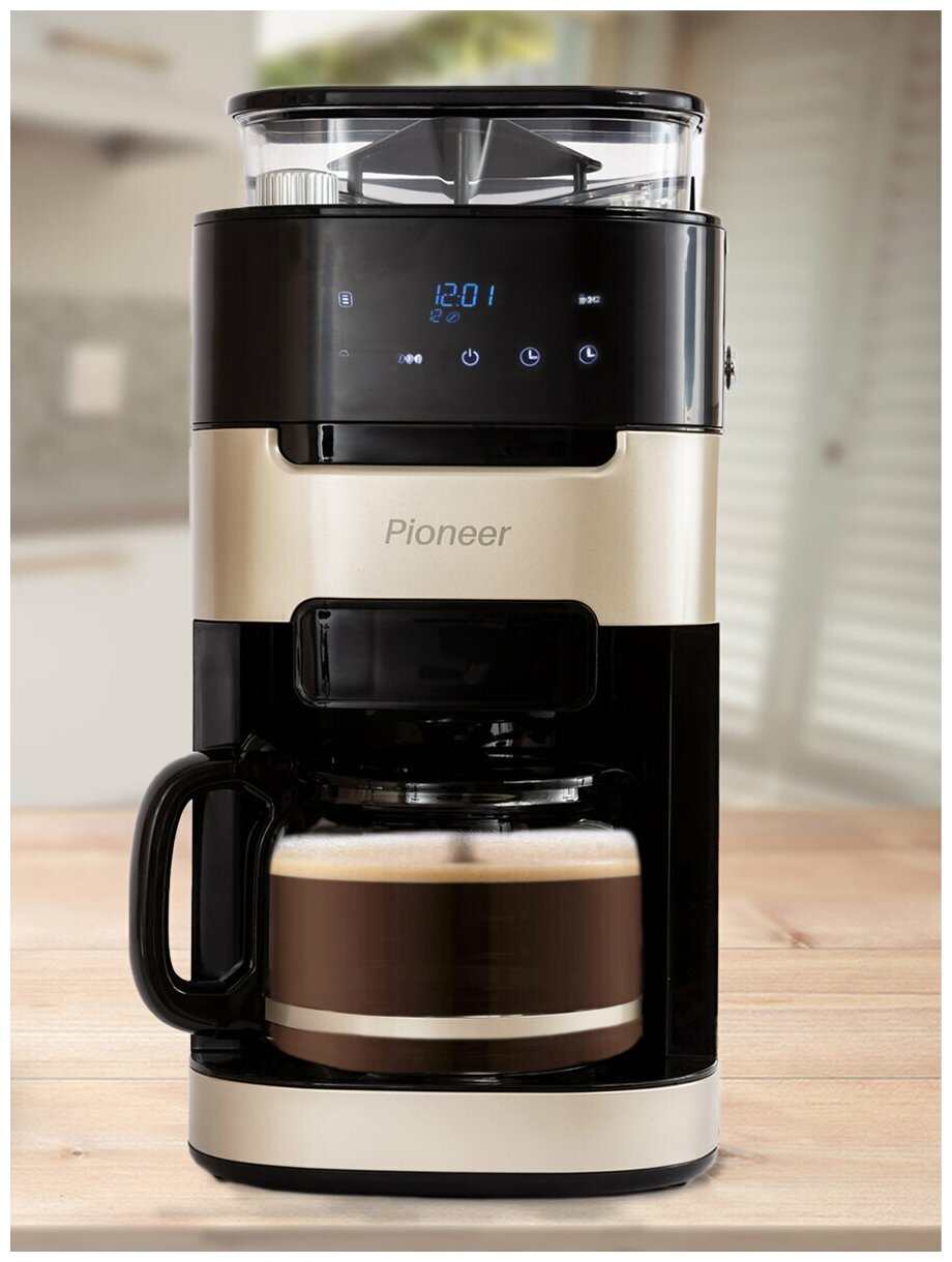 Автоматическая капельная кофемашина Pioneer с сенсорным управлением, встроенной кофемолкой жернового типа, отложенным стартом и автоматическим подогревом горячих напитков в течение 35 минут — подходит для профессионального пользования. Изготовлена из прочного пластика, украшена глянцевым покрытием с металлическими вставками золотистого оттенка. Корпус легко очищается от загрязнений, устойчив к деформациям и высоким температурам. Колба кофеварки выполнена из жаропрочного стекла, ее объем 1500 мл — для одновременной варки кофе на 12 человек. Мощность — 1050 Вт. Оборудована многоразовым фильтром. Во время работы зерна не перегреваются, поэтому напитки сохраняют насыщенный вкус и аромат. Ингредиенты не окисляются. Степень помола регулируется от крупного до мелкого — всего восемь ступеней. Предусмотрен выбор количества чашек. Удобно подбирать три уровня крепости.Оснащена прозрачным контейнером для кофейных зерен. На дне прибора закреплены прорезиненные ножки — снижают вибрацию, устройство не царапает стол. Установлен LED-дисплей — отображает заданные параметры, экран подсвечивается мягким синим цветом. Есть шкала уровня воды и часы. Система «Капля-стоп» предотвращает появление капель — специальный затвор останавливает подачу. Поддерживает защиту двигателя от засоров, заклинивания и неэффективного помола. По завершении работы издает три звуковых сигнала. Компактный размер и лаконичный дизайн — можно установить дома или в офисе, дополняет любой интерьер.
