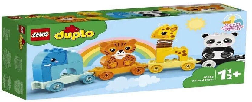 Все дети любят животных, верно? Набор «Мой первый поезд для зверей» LEGO® DUPLO® (10955) станет для малыша идеальным способом познакомиться с животным миром. Парад игрушечных животных. Юного любителя природы ждут слон, тигр, жираф и панда. В процессе игры дети смогут собирать и пересобирать вагоны, сцеплять их, размещать животных, снимать их с поезда и ставить одно на другое. При этом они развивают мелкую моторику и открывают для себя мир творческих ролевых игр. Такие функции, как подвижная шея жирафа, добавляют радости веселой развивающей игрушке. Карточки с изображениями моделей в натуральную величину позволяют собирать их, прикладывая кубики к картинке, а чтобы было еще веселее, поезд можно соединить с другими игрушками DUPLO на колесах. Практические обучающие игрушки для малышей. Игрушки LEGO DUPLO — это веселье без границ, самовыражение и веселое обучение для дошколят. С наборами DUPLO родители могут присоединиться к игре и наблюдать за важнейшими этапами развития своих малышей.- Порадуйте своего малыша этим очаровательным набором «Мой первый поезд для зверей» LEGO® DUPLO® (10955). В этом универсальном наборе есть 4 животных для сборки. Их можно брать, помещать и тянуть, и они идеально подходят для маленьких детских рук. - Содержит игрушки для сборки: слона (4 детали), тигра (2 детали), жирафа (3 детали) и панду (2 детали), а также 4 «вагончика» с колесами, чтобы их катать. - Дети смогут собирать и пересобирать вагоны, сцеплять их друг с другом, размещать животных, снимать их с поезда и ставить одно на другое. Наслаждаясь творческими ролевыми играми, дети развивают мелкую моторику рук. - В этом наборе для детей в возрасте от 18 месяцев есть все: практическое творчество, возможности для изобретательной игры и помощь в развитии ребенка. Это отличный подарок для малышей. - Размеры: более 14 см. в высоту, 45 см. в длину и 6 см. в ширину. Идеально подходит для маленьких детских рук. - Включает карточки с изображениями моделей в натуральную величину. Дети могут собирать модели, прикладывая кубики к картинке, а родители научат их распознавать цвета и формы. - У моделей хорошо знакомых животных разный уровень сложности сборки, чтобы ребенок мог развивать свои навыки. Особые функции, такие как подвижная шея жирафа, делают игру еще веселее. - Все наборы LEGO® DUPLO® отлично проработаны, и вас ждут возможности для свободной развивающей игры, драгоценные моменты которой родители могут разделить с малышами. - Все наборы LEGO® DUPLO®, произведенные с 1969 года, соответствуют самым строгим отраслевым стандартам, поэтому их удобно брать, складывать и разъединять маленькими детскими пальчиками. - Все кубики и детали LEGO® DUPLO® испытываются на падение, нагрев, удар и скручивание, чтобы убедиться в их соответствии самым высоким стандартам безопасности для детей.