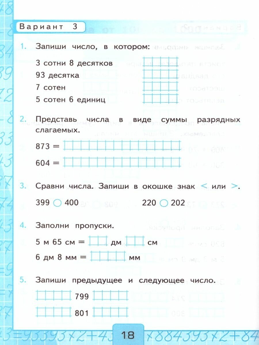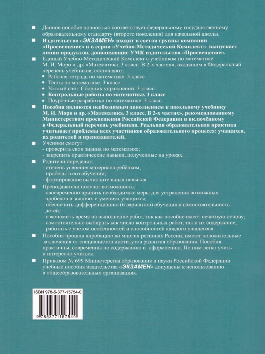 Пособие представляет собой сборник текущих и итоговых контрольных работ по математике к учебнику М. И. Моро и др. «Математика. 3 класс. В 2-х частях». Каждая контрольная работа дана в 6 вариантах.