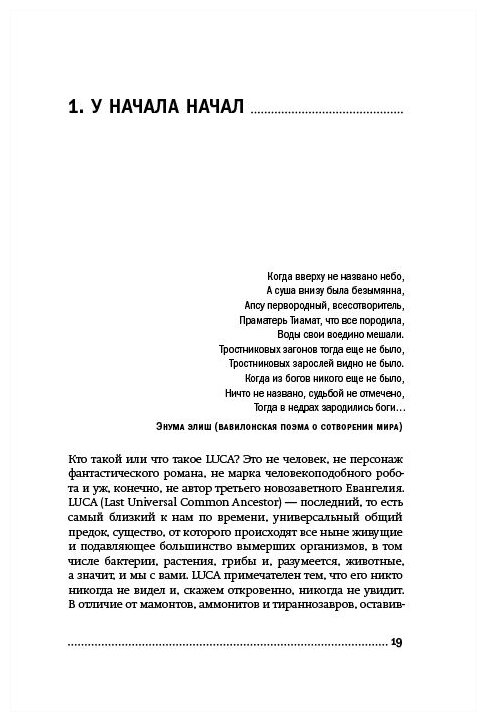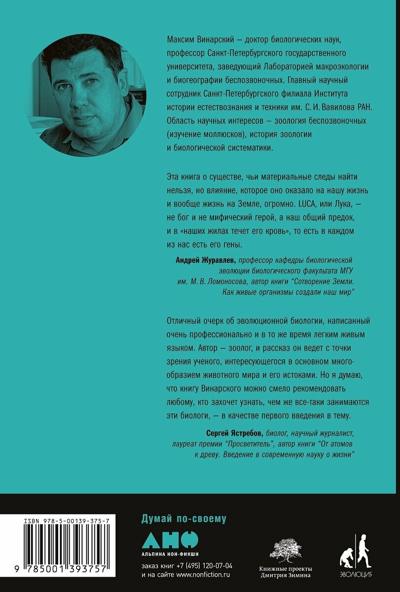 Книга «Евангелие от LUCA» рассказывает о мире животном и о роде человеческом. Только LUCA (Last Universal Common Ancestor) — не апостол, а наш общий предок, и, чтобы разобраться, что же это за существо, читатель вместе с автором книги, биологом Максимом Винарским, проделает путь протяженностью более 4 млрд лет. Он познакомится с историей возникновения и эволюцией многоклеточных животных. Выяснит, что мы, люди, всего лишь одна из многих ветвей великого Древа жизни, а вид Homo sapiens образовался в соответствии с законами, общими для эволюции всего живого. Поймет, каким образом биологи выявляют родственные связи между животными и восстанавливают пути их эволюции. Узнает о жизни и научных открытиях ученых — тех, кто пришел к идее эволюционного родства всех организмов на Земле и догадался, как это родство можно определить.