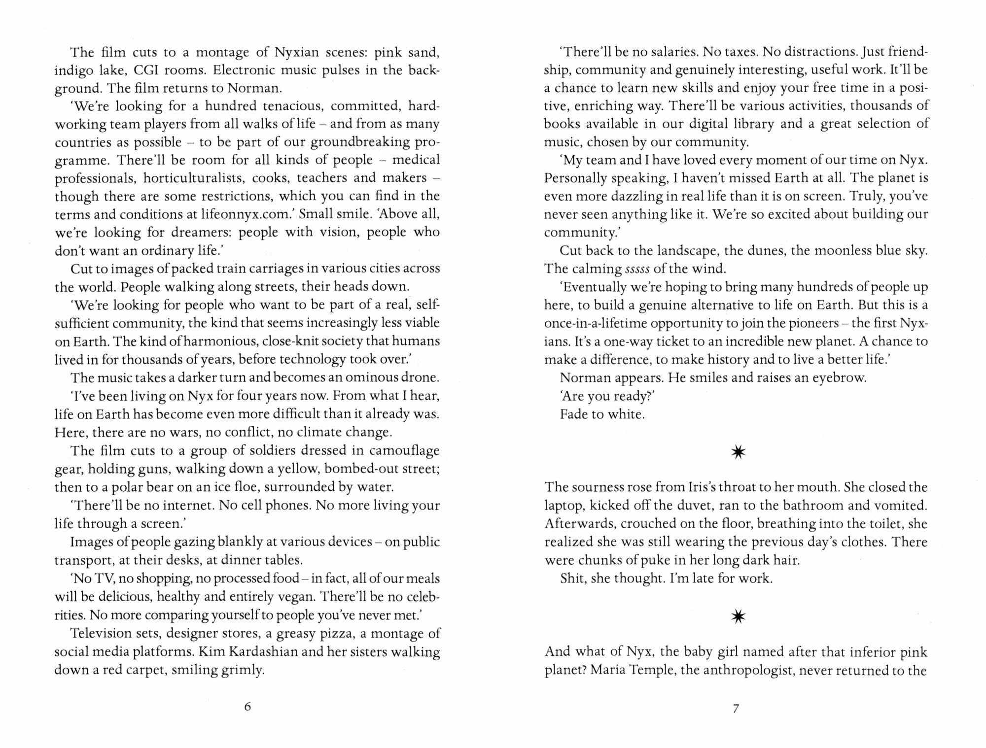 Then you hear about Life on Nyx, a programme that offers the chance to move to another planet and start a new, meaningful way of life. But there’s a caveat: if you go, you can never come back.