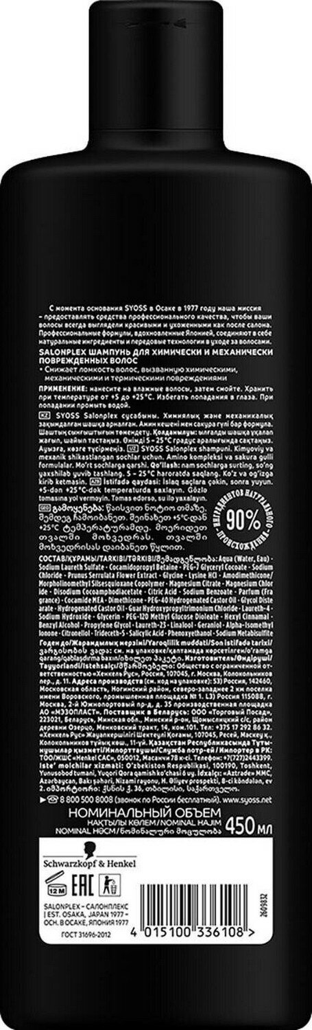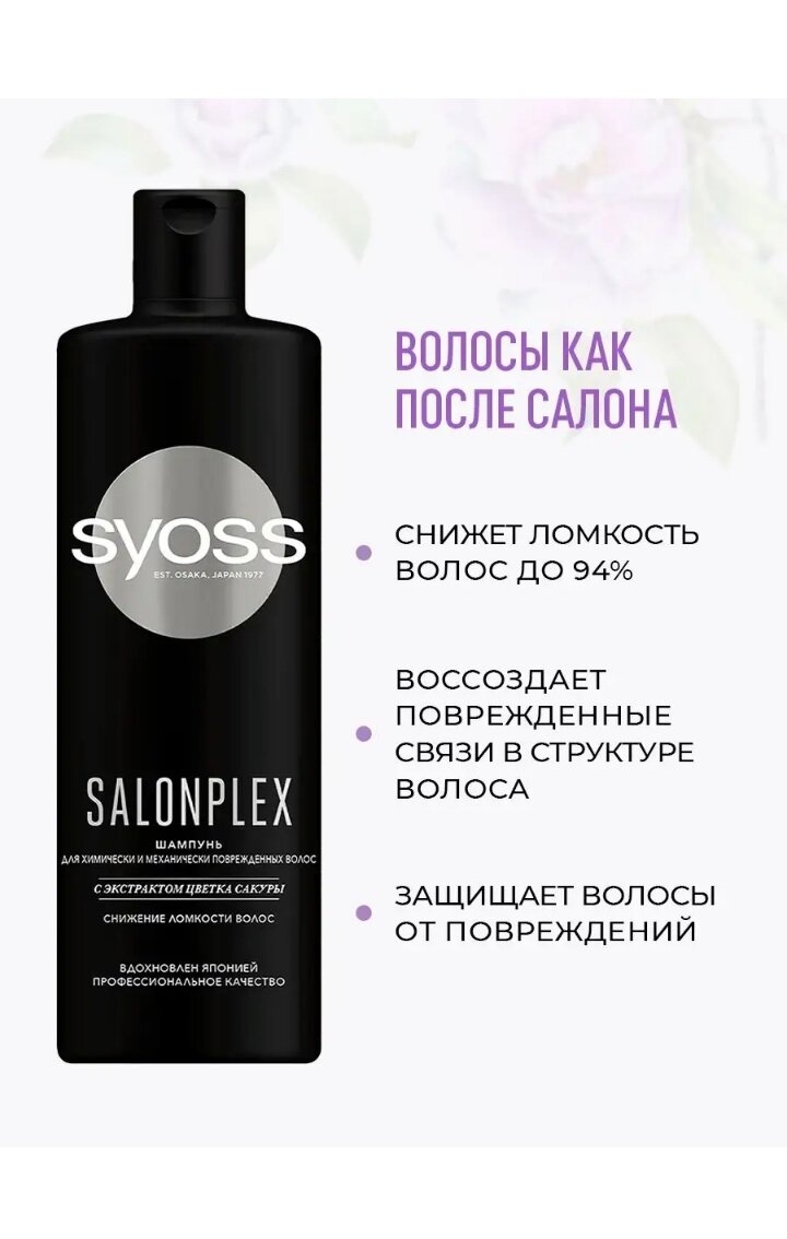 С момента основания Syoss в Осаке в 1977 году наша миссия – предоставлять средства профессионального качества, чтобы ваши волосы всегда выглядели красивыми и ухоженными как после салона. Профессиональные формулы, вдохновленные Японией, соединяют в себе натуральные ингредиенты и передовые технологии в уходе за волосами. Syoss шампунь Salonplex для химически и механически поврежденных волос:- Облегчает расчесывание.- Снижает ломкость волос, вызванную химическими, механическими и термическими повреждениями. В комплекте 2 шт