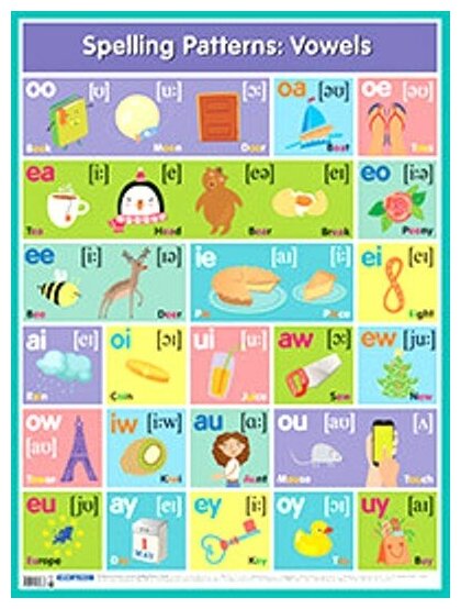Пособие "Буквосочетания. Гласные" наглядно иллюстрирует произношение наиболее распространенных буквосочетаний с гласными буквами английского языка. На плакате представлена таблица с буквосочетаниями, транскрипцией звуков, а также примерами слов. Материал структурирован так, чтобы облегчить запоминание английской фонетики, помочь ребенку "отработать" каждый звук и закрепить правильное произношение.