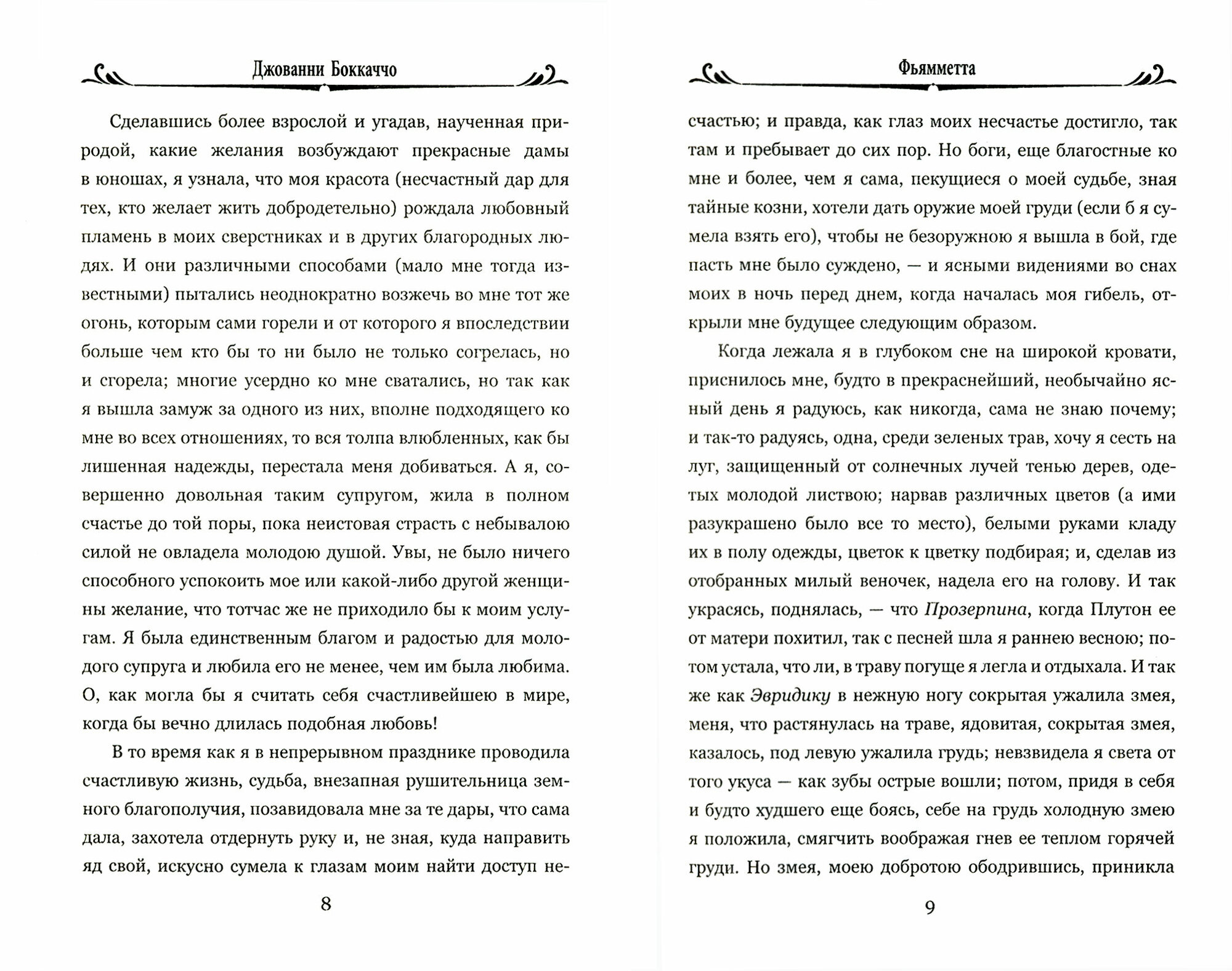 Безусловно красивая работа! Очень красивая! Безупречный стиль, насыщенный, превосходный. Читаешь и, просто, наслаждаешься каждым словом, каждым предложением. Гиперболы и эпитеты так и фонтанируют на каждой странице. И на этом заканчиваются все мои похвалы книге Боккаччо. Сейчас я говорю про "Фьямметту". Изобилие красочных описаний чувств, эмоций, преображений и поведения главного персонажа - преобладающая часть книги. Но данный роман читают не ради основного сюжета, а именно ради красоты изложения. В целом, я довольна, что наконец-то познакомилась с работами Боккаччо.