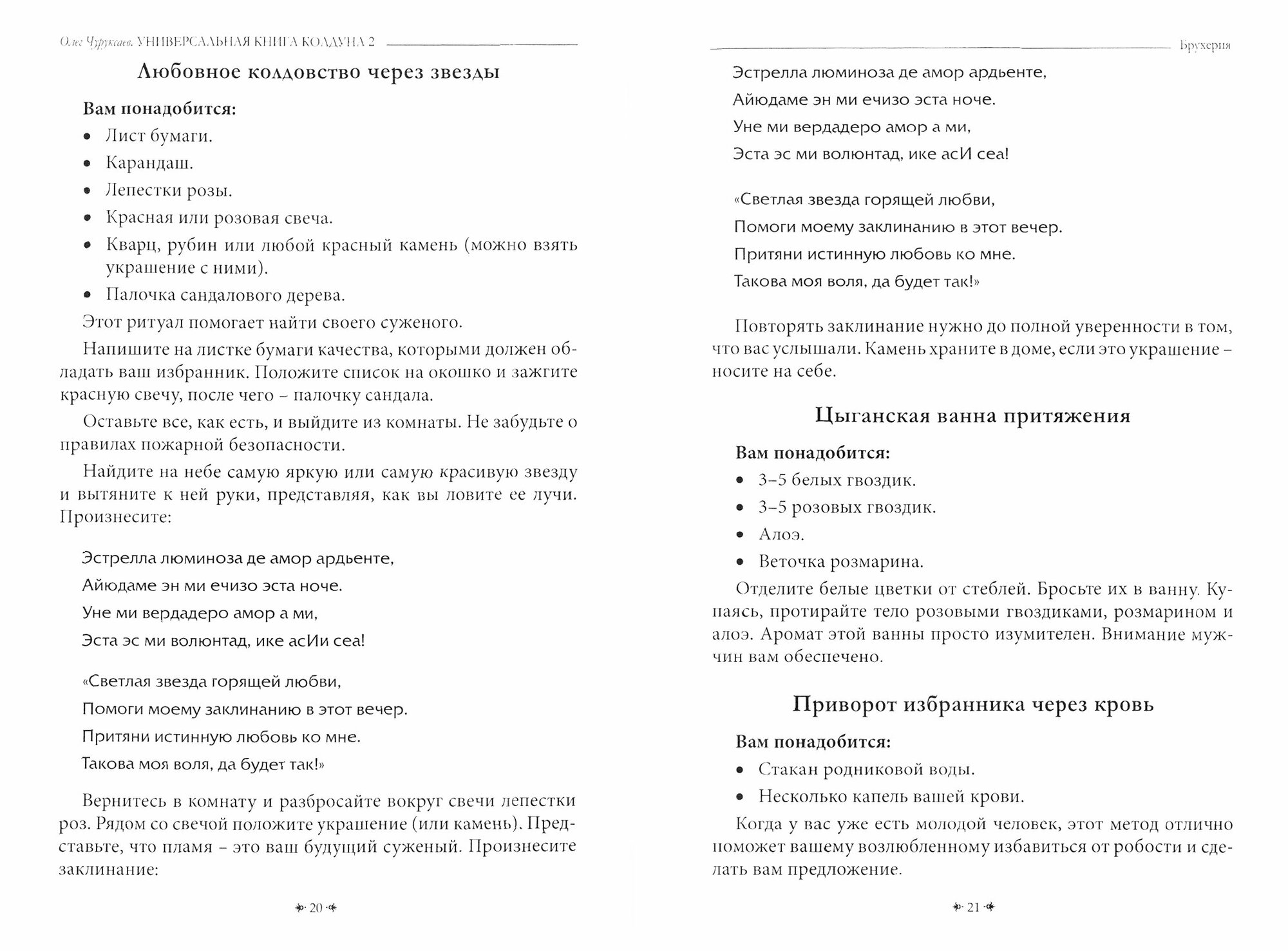Данную Книгу приобретала с одной целью найти подтверждение тому, как можно снять порчу, но в данной книге всё изложено очень сумбурно сплошная чёрная магия с текстами заклинаний на совершенно не понятном языке типа : Абракодабра "Асф комо те пизо ...и т.д...." при этом нет разьяснений, что это за язык. Кроме того создалось впечатление, что матерьял для данной книги был собран отовсюду в т.ч. и с просторов интернета. В ней собрано все в одну кучу, там же и Молитвы, псалмы, куклы вуду, порчи проклятия и т.д. нет ни какой последовательности в изложении материала, например возьмите масло "приди ко мне".
