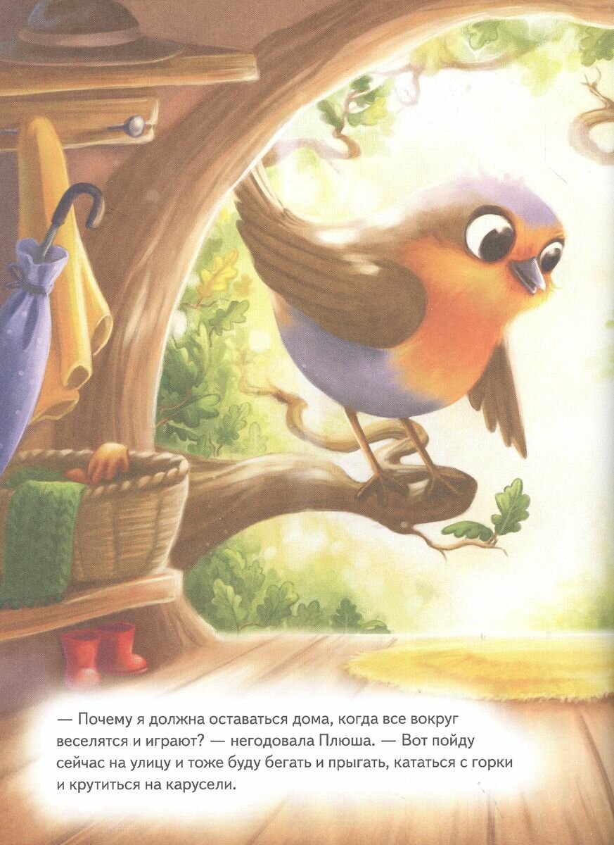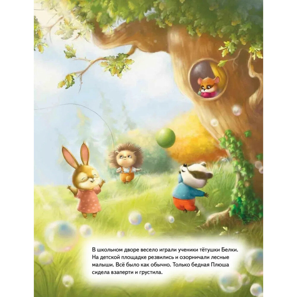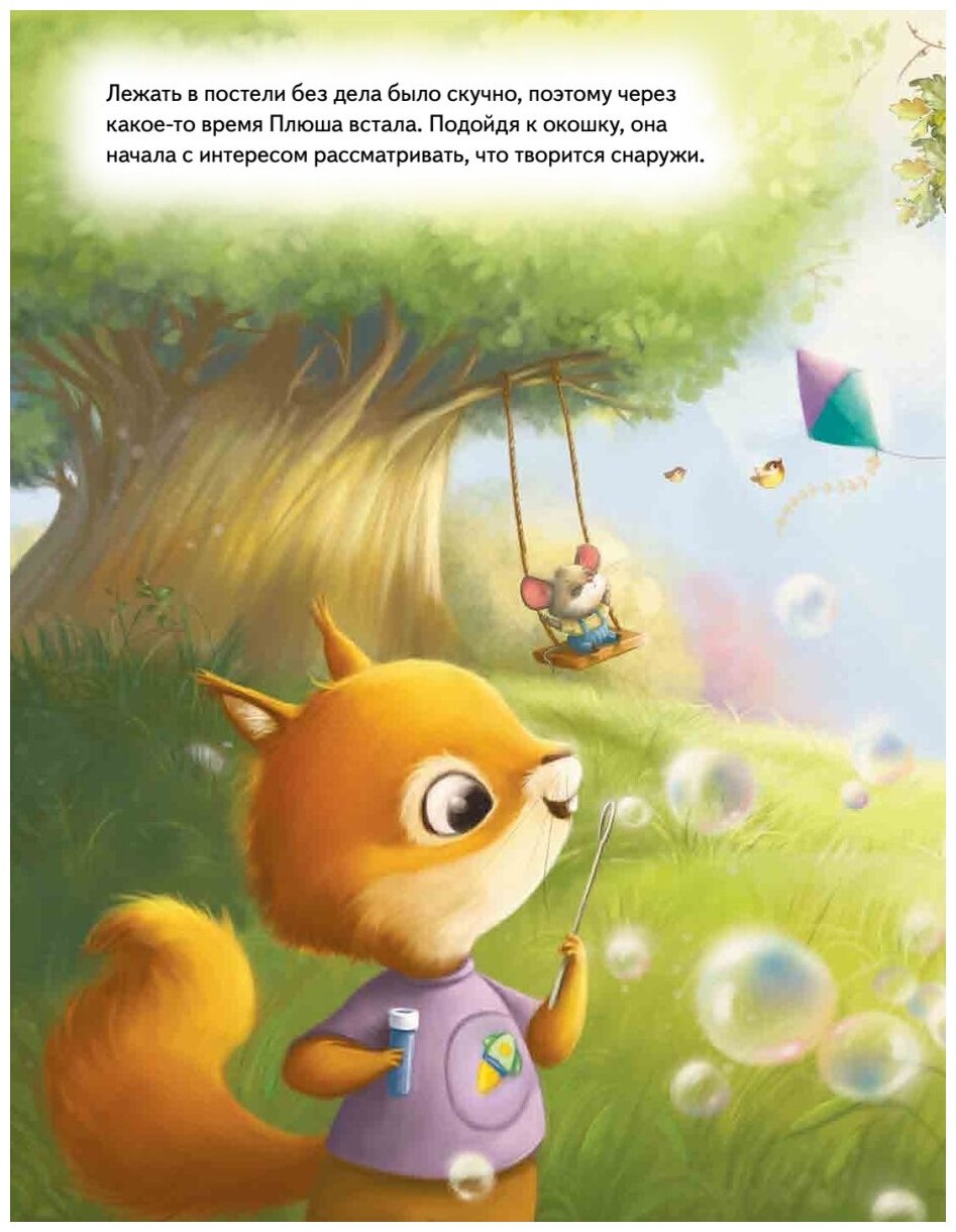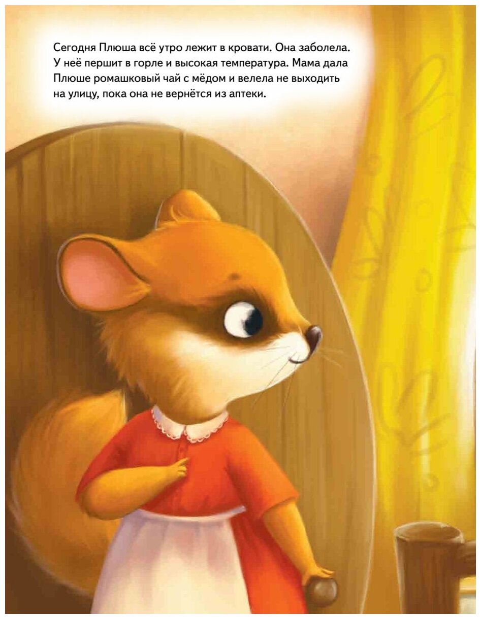 Плюша - маленький зверек-соня. Вместе с мамой и папой она живет в дупле старого дуба. Ей очень нравится ходить в Лесную школу, печь пироги и собирать ягоды. А еще, как и все дети на свете, Плюша обожает приключения! Но однажды малышка заболела. Ах, как грустно сидеть дома с больным горлышком, когда друзья на улице резвятся и играют! Так хочется к ним! Хорошо, что птички Зарянка и Дятел научили Плюшу заботиться не только о себе, но и об окружающих. Поскорее открывай книгу - благодаря лесным секретам ты будешь самым здоровым!