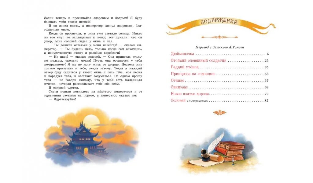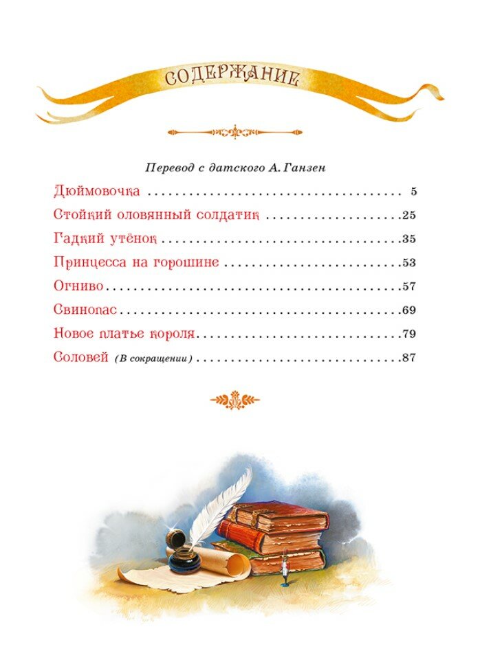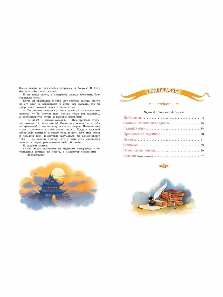 В книгу вошли самые известные и любимые произведения великого сказочника в переводе прекрасного переводчика Анны Ганзен. Это "Дюймовочка", "Гадкий утёнок", "Огниво", "Принцесса на горошине", "Стойкий оловянный солдатик", "Свинопас", "Новое платье короля" и "Соловей". Сказки Андерсена очень самобытны и резко выделяются среди произведений других писателей-сказочников. И хотя в них много печали и грусти, благодаря своей поэтичности и красоте они пробуждают в душе каждого самые светлые и тёплые чувства.