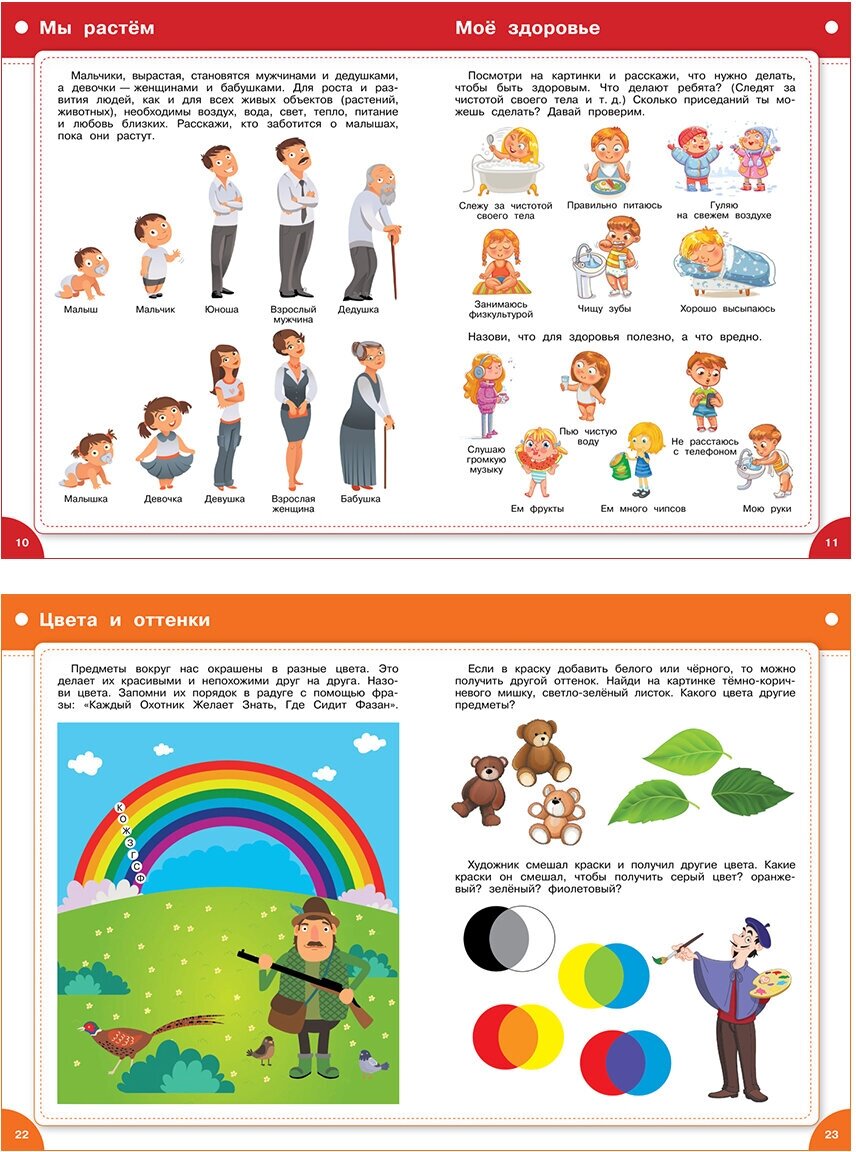 Книга в твердой обложке. Подходит для расширения кругозора, развития интеллекта и формирования познавательного интереса. При помощи этой книги мы с дочкой разбираем самые важные темы: семья, тело, цвета, размеры и тд. Иллюстрации в книге очень яркие и красивые, при этом простые, подходящие для детей от 3 до 5 лет. Информация подается просто и доступно. Есть загадки, задания для выполнения. Мой ребенок в восторге!