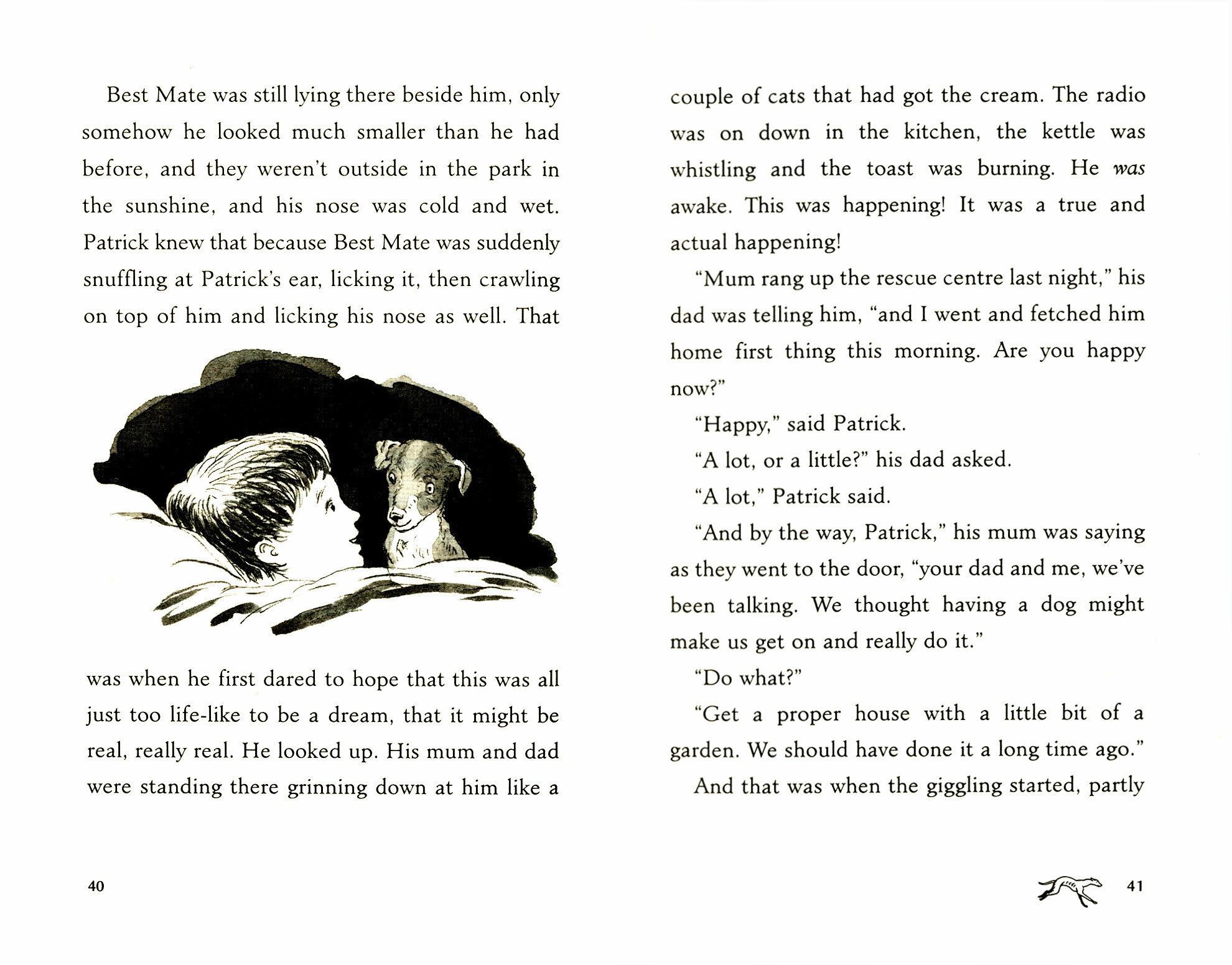 When Patrick saves a litter of greyhound puppies from the canal, he can't bear to hand them all over to the RSPCA. He pleads with his parents: couldn't he just keep one of them? But nothing will convince them and Patrick cries himself to sleep - only to be woken by a greyhound puppy licking his face!