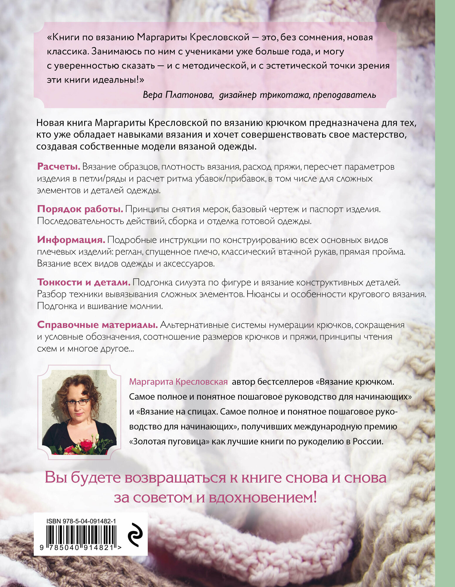 Новая книга автора бестселлера "Вязание крючком. Самое полное и понятное пошаговое руководство", признанного лучшей российской книгой по рукоделию на международном конкурсе "Золотая пуговица", Маргариты Кресловской рассказывает о моделировании вязанной крючком одежды. Большая и прекрасно иллюстрированная энциклопедия содержит все самое важное и необходимое, чтобы научиться создавать шапки и варежки, носки и свитеры, кардиганы и митенки, словом, все, что подскажет вам ваша фантазия. Книга предназначена для тех, кто уже обладает навыками вязания и хочет совершенствовать свое мастерство, и для всех, кому во время работы может понадобиться совет или доступный справочный материал. Самое полное и понятное руководство не предлагает вам вязать конкретные авторские модели, оно дает нечто гораздо более ценное - знания, навыки и полезную информацию, которые будут необходимы всю жизнь! Методически выверенная последовательность подачи материала, понятное и доступное изложение, иллюстрированное многочисленными рисунками и схемами, подробное объяснение каждого шага работы. Вы будете возвращаться к книге снова и снова за советом и вдохновением!