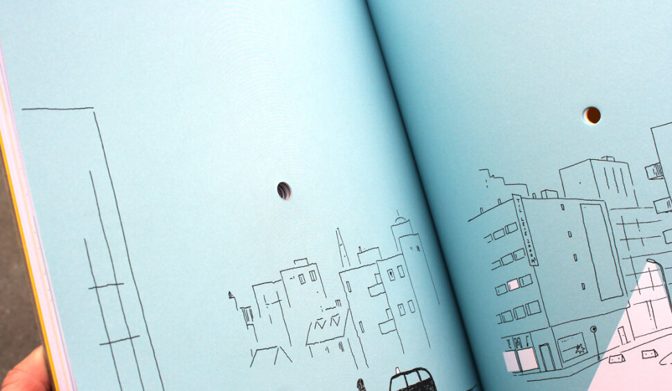 адывать её в головы нужно как раз взрослым. В общем, сплошная загадка.) Сюжетно дырка посередине книжки обыграна многократно, но не на каждой странице её участие в декорациях уникально: иногда и повторяются, например несколько раз она предстаёт в виде фонарей и колёс автомобилей.