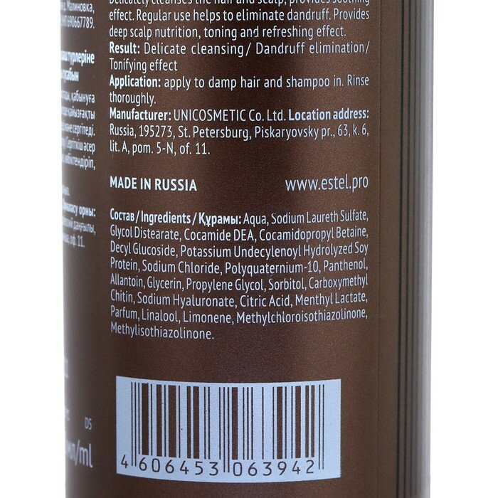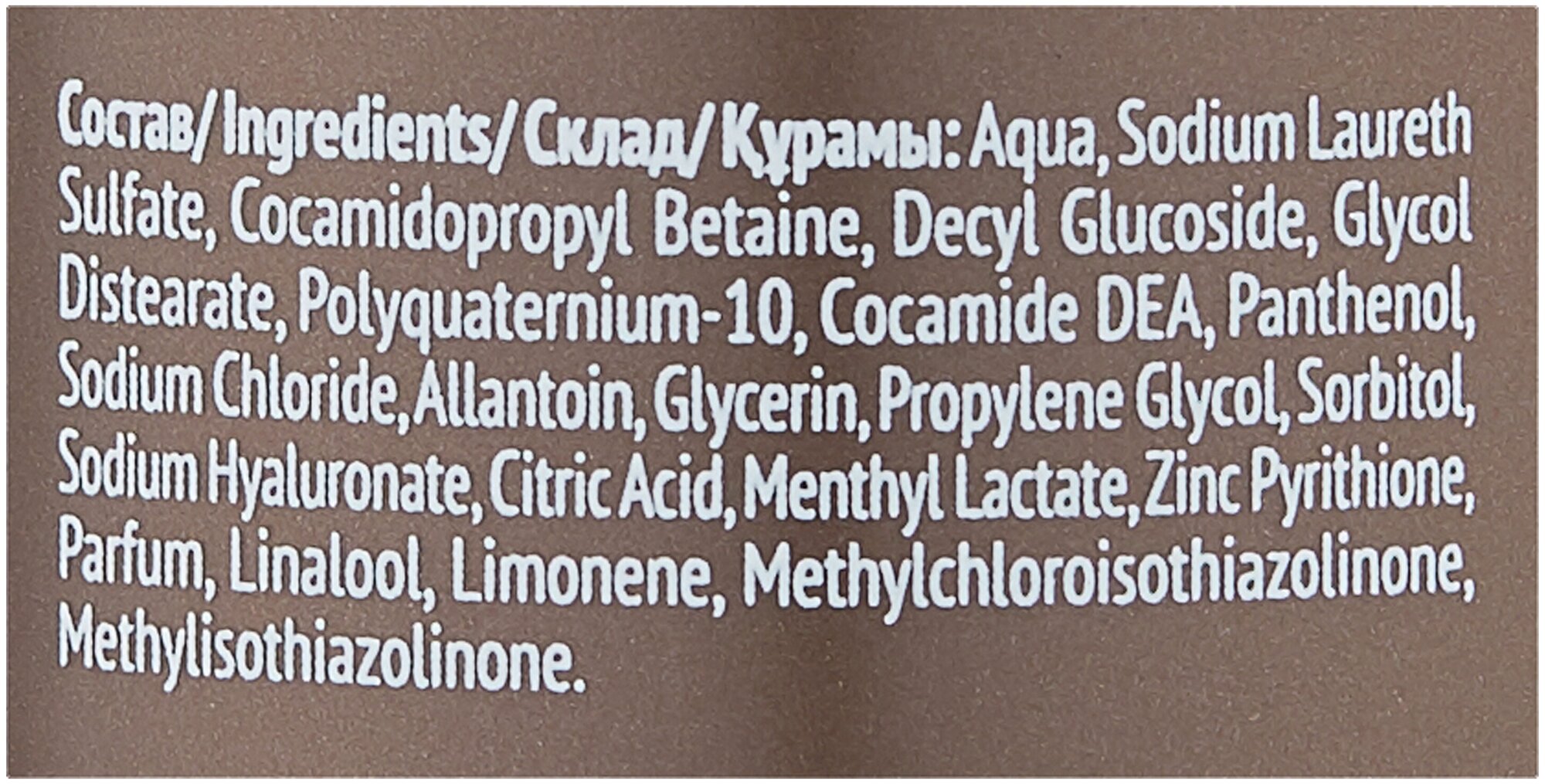 Состав: aqua, sodium laureth sulfate, cocamidopropyl betaine, decyl glucoside, glycol distearate, polyquaternium-10, cocamide dea, panthenol, sodium chloride, allantoin, glycerin, propylene glycol, sorbitol, sodium hyaluronate, citric acid, methyl lactate, zinc pyrithione, parfum, linalool, limonene, methylchloroisothiazolinone, methylisothiazolinone