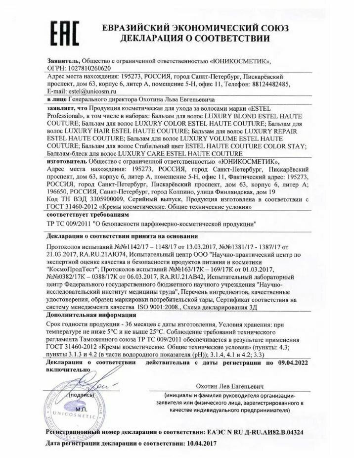 | Эффект от использования | восстанавливающий, придающий объем, придающий эластичность, разглаживающий, уплотняющий |