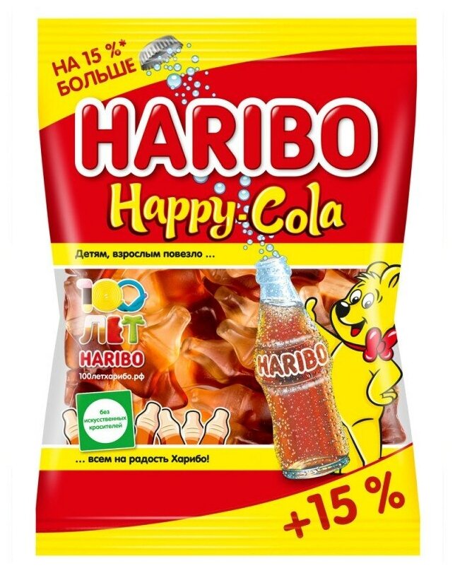 Жевательный мармелад Haribo (Харибо) cola в форме бутылочек, уже знакомой газировки - любимое мармеладное лакомство и взрослых, и детей богатое витаминами, произведенное в Турции. Все потому что мармелад кока кола бутылочки, как радуга - заряжают позитивом и бодростью на целый день! Мягкая и сочная консистенция, а также нежный, сливочный, кисло-сладкий вкус покорят вас, в то время как узнаваемые нотки cola, напомнят о детских беззаботных порах. Мармелад относится к продуктам питания, которые выполнены из растительных, натуральных компонентов и фруктовой смеси, а умные родители выбирают именно такие сладости, и дети их просто обожают. Хоть это и не еда для своих чад, но зато великолепный перекус. Это фигурный мармелад для детей, его можно даже самым маленьким, он не вредит зубам, а еще он порадует большую компанию.