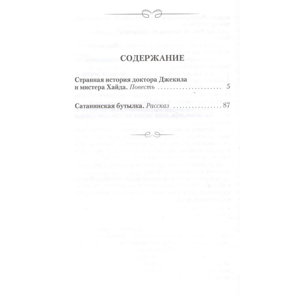 Роберт Льюис Стивенсон - непревзойденный мастер захватывающих сюжетов. В повести "Странная история доктора Джекила и мистера Хайда" писатель дает гениальное описание двойственности человеческой натуры: внутри каждого из нас дремлет свой мистер Хайд, и только от самого человека зависит, кого выпустить на волю - ангела или демона. Рассказ-притча "Сатанинская бутылка" - история об искушении и расплате, о том, как жажда легкой наживы ведет человека в ад.