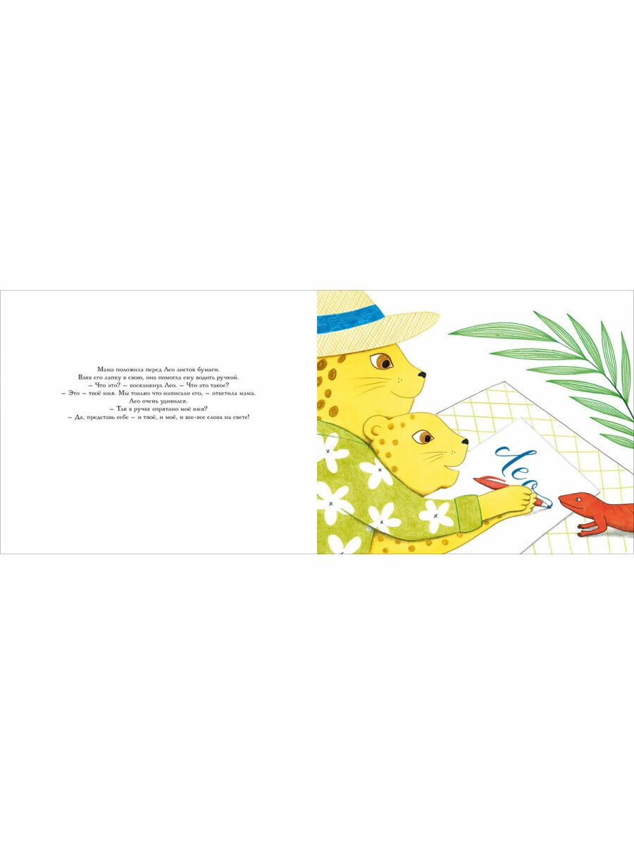 Книгу покупала из-за того, что в названии фигурирует папа, ребёнку 3 лет довольно ощутимо не хватало папы, пока он на работе и для компенсации я купила несколько книг про папу, чтоб образ отца незримо присутствовал с нами и в его отсутствие. Книга нас не разочаровала, исполнение очень красивое и нежное, использованы бело-желто-салатовые тона, необычный главный герой леопардик и мотив ухода папы после вручения подарка, что ведёт в цепи попыток разгадать значение его подарка - фломастера. В итоге герой учится писать, это и тема папы и мотивация для обучения письму. Книга классная, но немного смутил довольно мелкий шрифт при малом объёме текста - страницы выглядят пустовато, хотя для меня это не столь уж значимый недостаток