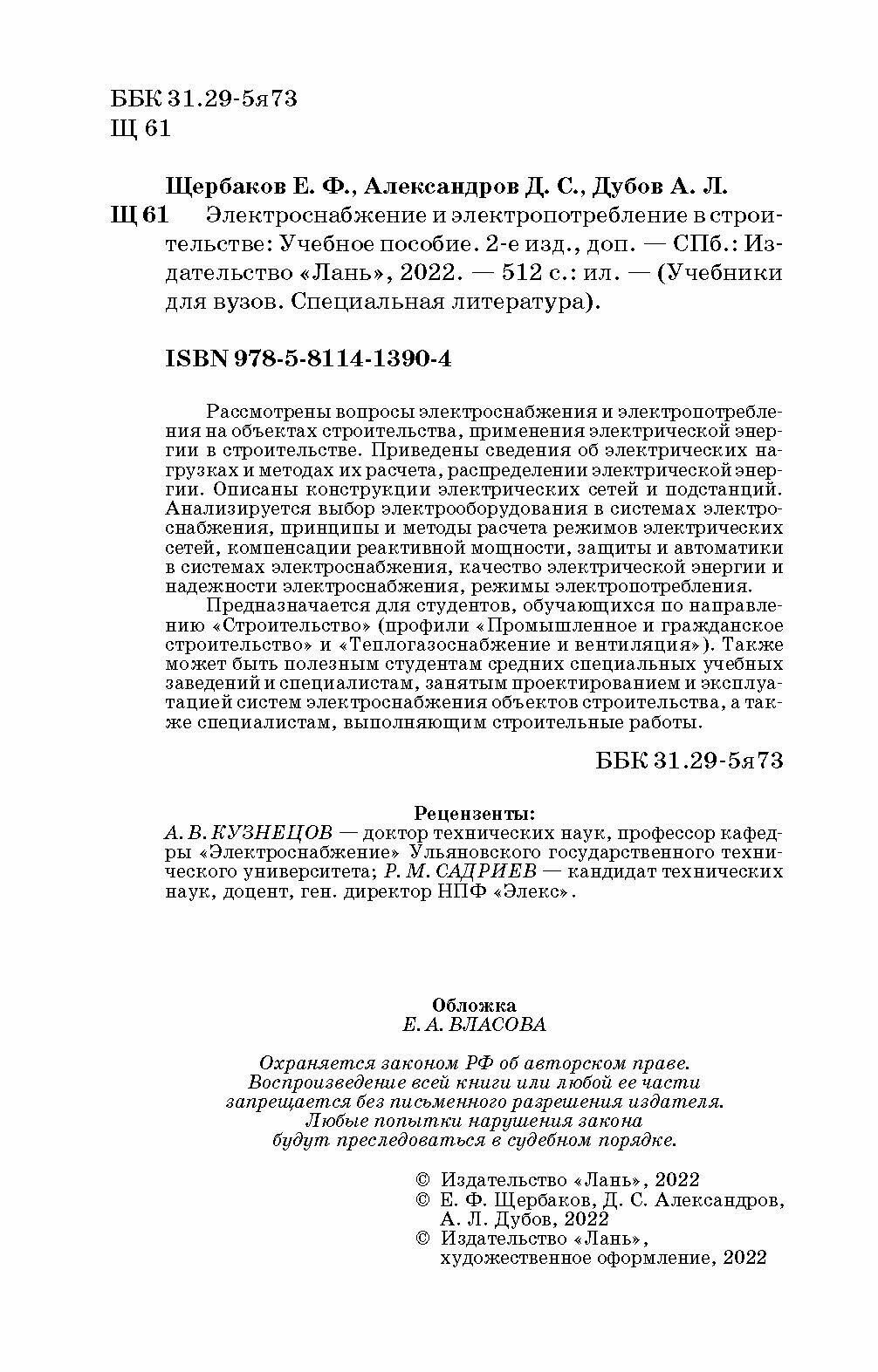 Электроснабжение и электропотребление в строительстве (Щербаков Евгений Федорович, Александров Дмитрий Степанович, Дубов Александр Леонидович); Лань, 2013