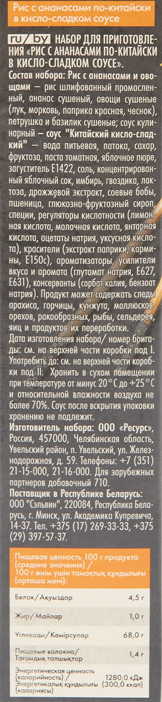 На сегодняшний день товар «Набор для приготовления Увелка Рис с ананасами по-китайски в кисло-сладком соусе 290г РЕСУРС» можно купить с кешбеком в 1 магазине: Яндекс.Маркет