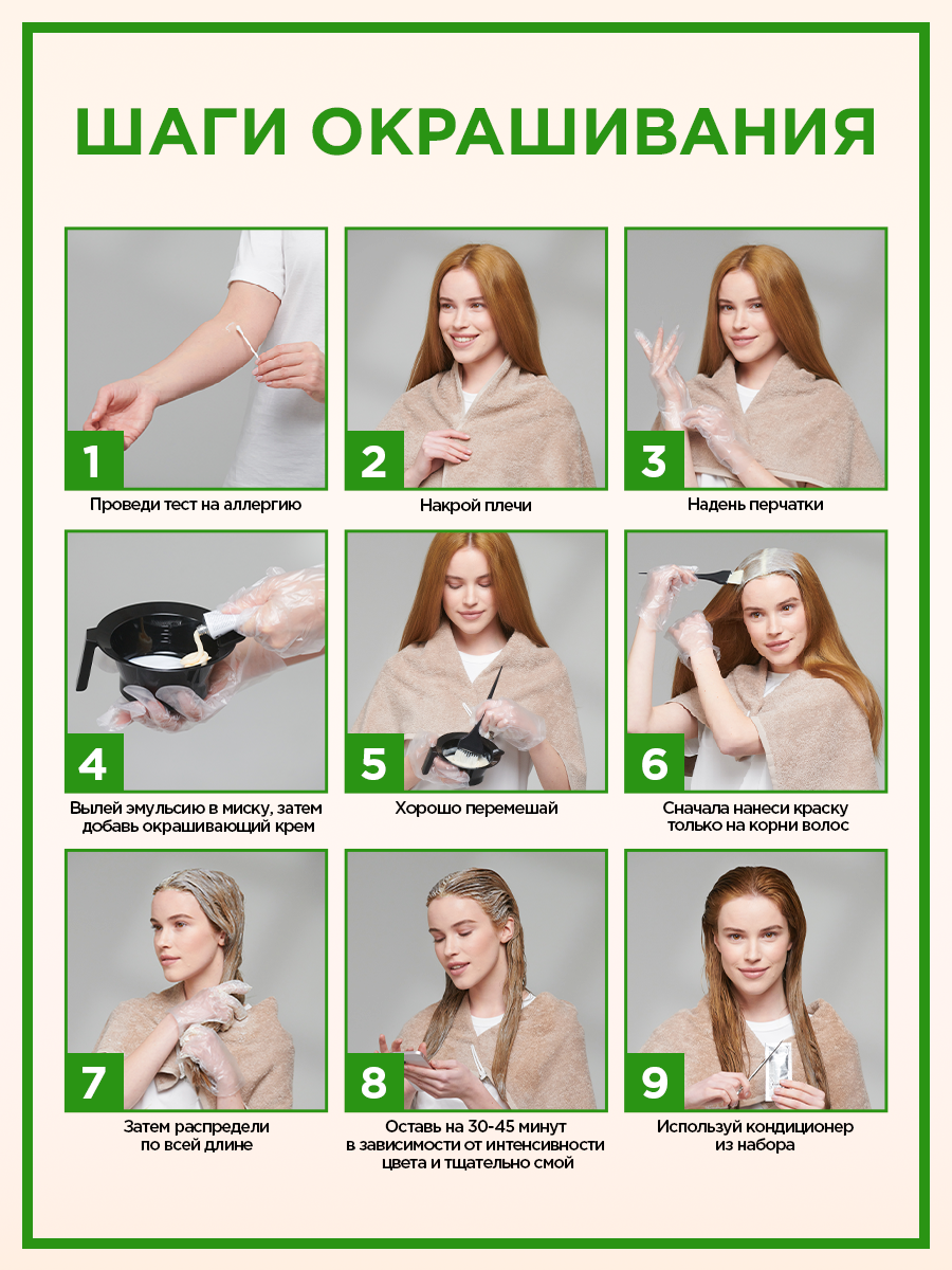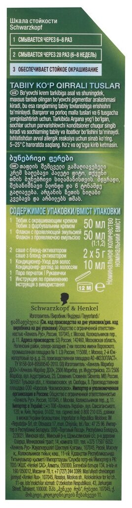| Состав набора | 1 тюбик с стойкой крем-краской; 1 флакон с проявляющей эмульсией; 1 пакет с кондиционером; 1 инструкция; 1 пара перчаток |