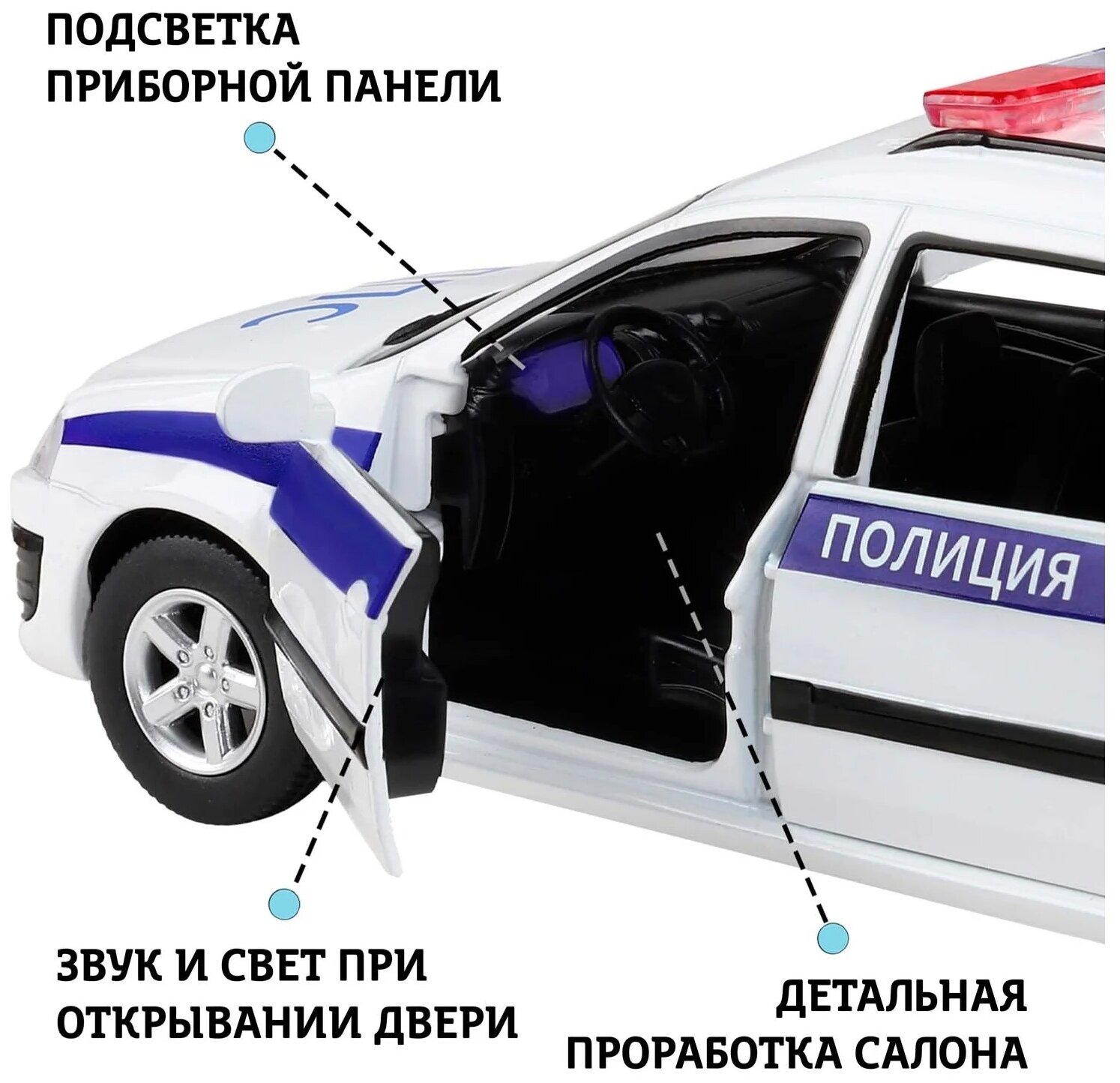 Модель выполнена в масштабе 1:24. У нее открываются передние и задние двери, капот и багажник. Колеса с резиновыми покрышками, рейлинги на крыше кузова, полицейская мигалка и раскраска - всё как у настоящего автомобиля.