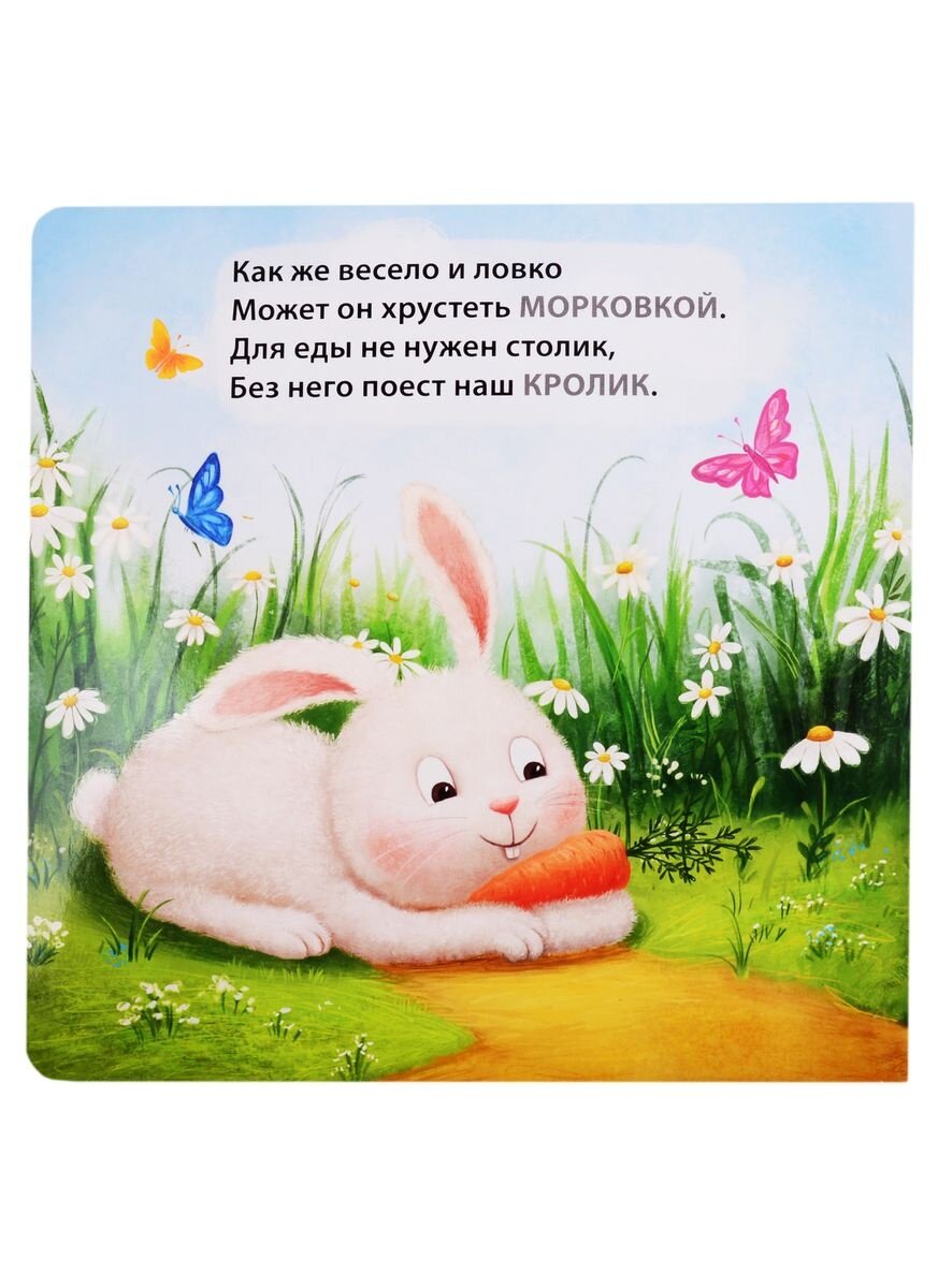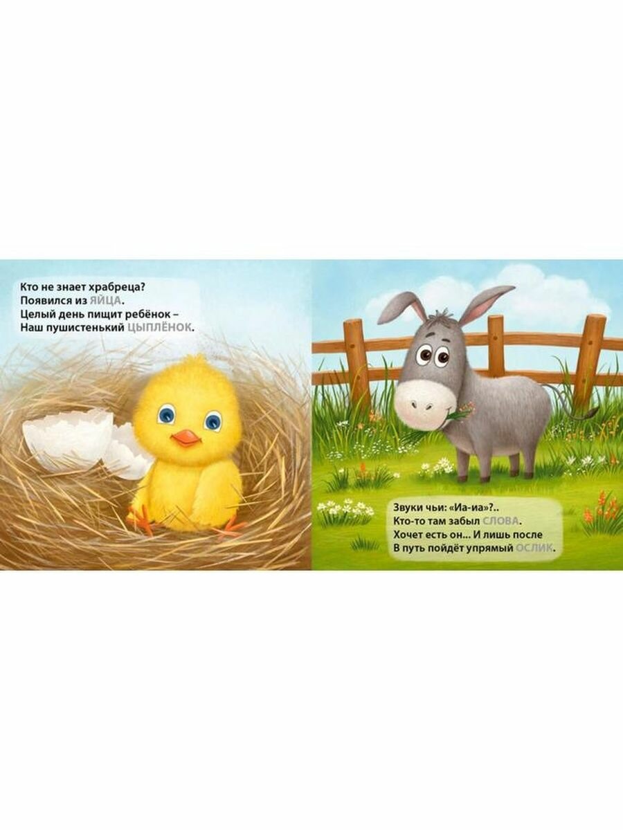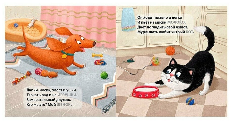 - Стихи, которые написаны так, чтобы ребенок смог сам срифмовать название животного или другие слова.Красочные крупные картинки.
