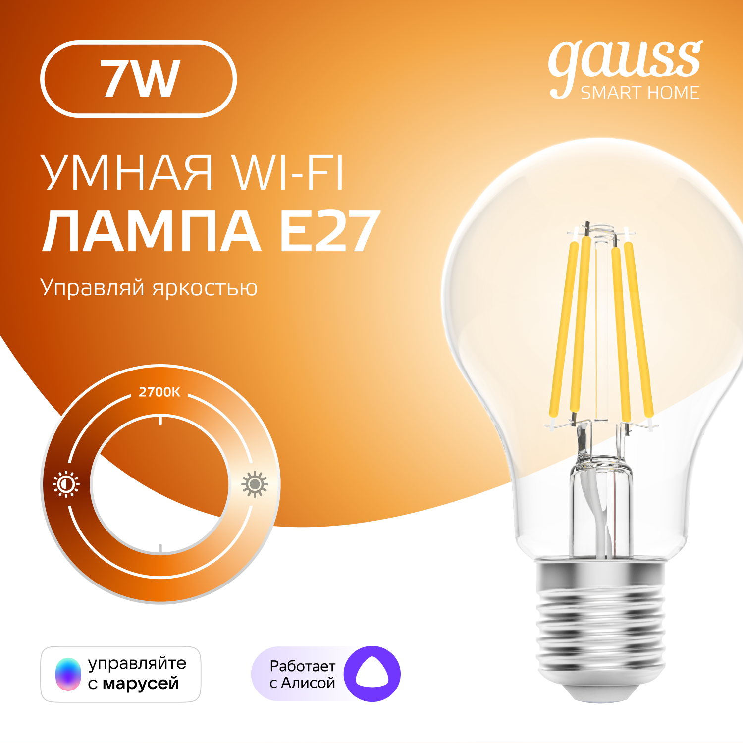 Умная Wi-fi филаментная лампочка Gauss Smart Light DIM E27 A60 7 Вт 2700-6500K, диммируемая, управление голосом/смартфоном Дистанционное управление: управляйте светом через мобильное приложение или голосовой помощник (Алиса, Siri, Google, Маруся)∙ Установка расписаний: автоматизируйте пространство. Свет будет включаться и выключаться по вашему расписанию.∙ Режимы: режимы созданы в Париже специалистами по световым решениям.Температура: свечение может меняться от теплого золотисто-желтого цвета до холодного ослепительно-белого.∙ Сцены: понравился режим в той или иной комнате? Зафиксируйте его в сцене и включайте одним кликом на смартфонеУмный дом начинается с лампочки Gauss Smart! Помимо филаментных ламп в ассортименте бренда представлены и другие умные устройства, среди которых: лента, датчик движения, розетка, светодиодные лампы, а также встраиваемые и накладные светильники. Управляйте светом – управляйте вдохновением вместе с Gauss