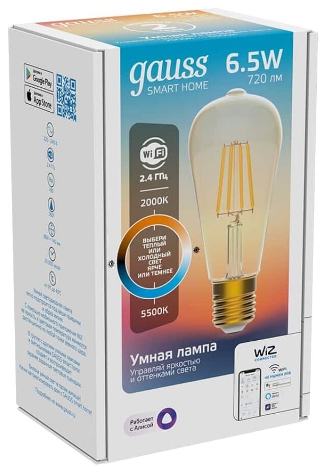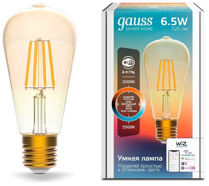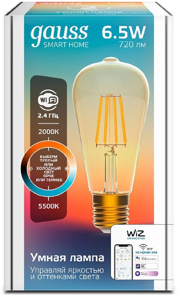 Умная Wi-fi филаментная лампочка Gauss Smart Light ССТ DIM E27 ST64 6,5 Вт 2700-6500K, диммируемая с изменением температуры, управление голосом/смартфономДистанционное управление: управляйте светом через мобильное приложение или голосовой помощник (Алиса, Маруся)∙ Установка расписаний: автоматизируйте пространство. Свет будет включаться и выключаться по вашему расписанию.∙ Режимы: режимы созданы в Париже специалистами по световым решениям.Температура: свечение может меняться от теплого золотисто-желтого цвета до холодного ослепительно-белого.∙ Сцены: понравился режим в той или иной комнате? Зафиксируйте его в сцене и включайте одним кликом на смартфонеУмный дом начинается с лампочки Gauss Smart! Помимо филаментных ламп в ассортименте бренда представлены и другие умные устройства, среди которых: лента, датчик движения, розетка, светодиодные лампы, а также встраиваемые и накладные светильники. Управляйте светом – управляйте вдохновением вместе с Gauss