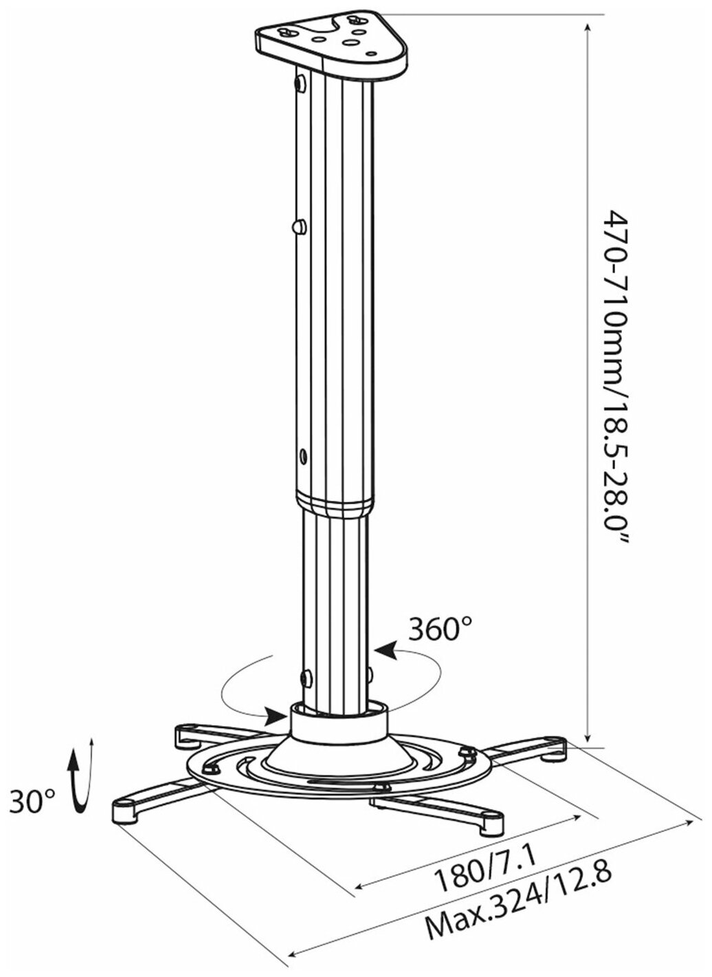 Кронштейн для проектора Cactus CS-VM-PR05L с настенным или потолочным креплением предоставляют возможность максимально эффективного размещения проекционного оборудования в помещении. Кронштейны Cactus изготовлены из алюминия или стали, что гарантирует прочность конструкции при небольшом собственном весе. Дистанция до потолка/стены: 470-710 мм, наклон: +-30 градусов, вращение: 360 градусов, поворот: +-30 градусов, установочные отверстия: 18-32 см