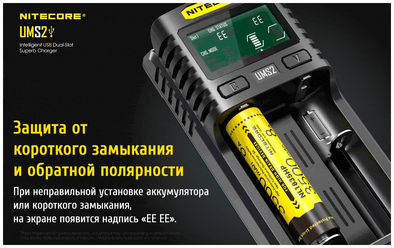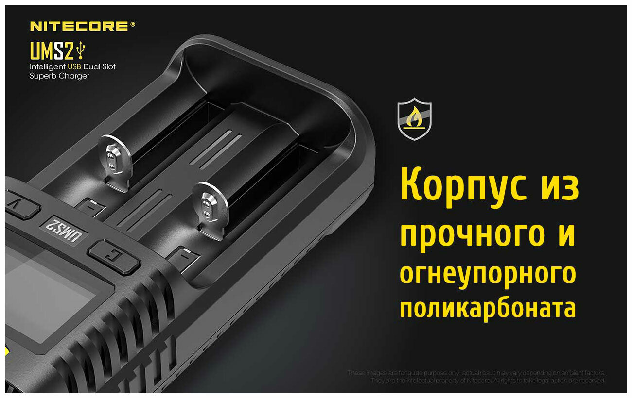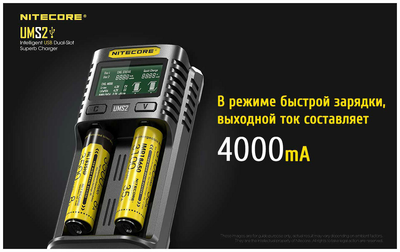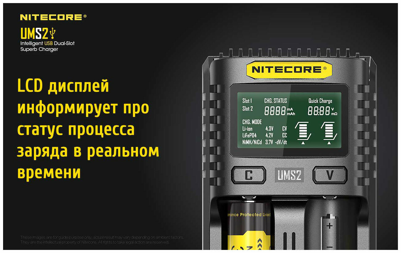 Зарядное устройство Nitecore UMS2, USB кабель, инструкция, фирменная упаковка Зарядное устройство Nitecore UMS2 оборудовано высококачественным дисплеем, отображающим полную информацию о текущем процессе в реальном времени. Помимо качественного отображения элементов, устройство может похвастаться и уникально внедренной технологией, позволяющей отображать рабочее состояние установленного элемента питания и тем самым вывести его на экран, классифицируя как «хорошее» или «плохое». Также отображается зарядный ток, внутреннее сопротивление, напряжение аккумулятора, заряженный объём, время зарядки, тип аккумулятора, установленный режим зарядки (CC, CV, dV/dt), графическое обозначение объема и выбранный канал.