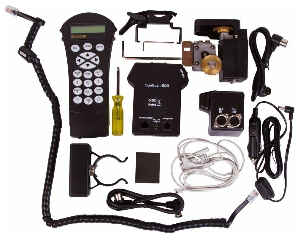 Комплект предназначен для модернизации монтировки EQM-35 с ручным управлением. Он превращает ее в современную компьютеризированную монтировку, способную самостоятельно наводить телескоп на 42 000 астрономических объектов. Каталоги базы данных включают координаты звезд, планет, созвездий, туманностей, галактик и многого другого. Любимые объекты наблюдений можно занести в отдельный пользовательский каталог. Для управления монтировкой используется проводной пульт SynScan. Он передает команды на электроприводы, которые отвечают за перемещение монтировки. Наведение на объект и ведение его по небосклону происходит в полностью автоматическом режиме. При работе двигателей ход монтировки ровный и плавный, поэтому этот комплект можно посоветовать тем, кто увлечен астрофотографией.