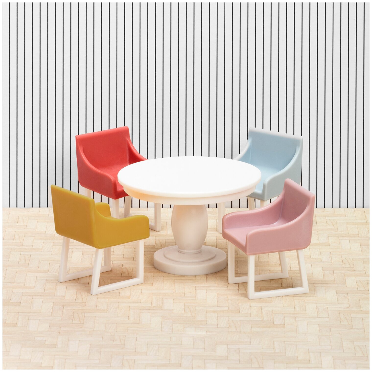 • Рекомендуется для мальчиков и девочек. • Возрастные рекомендации: от 3 лет. • Набор представлен игрушечной мебелью для кукол высотой 10-12 сантиметров. • Элементы выполнены в виде круглого стола и четырех стульев. • Гарнитур станет украшением кухни и любой другой комнаты в кукольном домике и подарит ребенку возможность расширить границы сюжетно-ролевых игр с куклами. • Все элементы имеют реалистичный дизайн и являются уменьшенными масштабными копиями реальной мебели в пропорции 1:18. • Все элементы выполнены с высокой степенью детализации, качественно и аккуратно. • Украшая комнаты кукольного домика мебелью и делая его интерьер более уютным, ребенок сможет проявить творческие способности, креативность и художественный вкус. • Правдоподобные сюжетно-ролевые игры с куклами способствуют развитию воображения и фантазии, способствуют социализации ребенка, помогают развивать логическое мышление и моторику рук. • Элементы набора выполнены из качественного и прочного пластика, окрашенного безопасными для здоровья ребенка красками. • Комплект гармонично сочетается с кукольными домиками, наборами мебели и куклами от данного производителя. • Комплект: круглый стол, 4 стула. • Комплект: кухонный гарнитур, холодильник.