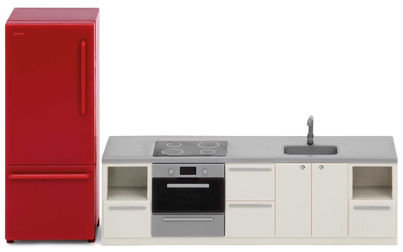• Рекомендуется для мальчиков и девочек. • Возрастные рекомендации: от 3 лет. • Набор представлен игрушечной мебелью для кукол высотой 10-12 сантиметров. • Элементы выполнены в виде кухонного гарнитура с холодильником. • На кухонном острове есть плита, духовка, мойка и раковина, а также два открытых отсека для хранения вещей. • Большой красный холодильник дополняет набор. Двери холодильника отрываются. • Гарнитур станет украшением кухни в кукольном домике и подарит ребенку возможность расширить границы сюжетно-ролевых игр с куклами. • Все элементы имеют реалистичный дизайн и являются уменьшенными масштабными копиями реальной мебели в пропорции 1:18. • Все элементы выполнены с высокой степенью детализации, качественно и аккуратно. • Украшая комнаты кукольного домика мебелью и делая его интерьер более уютным, ребенок сможет проявить творческие способности, креативность и художественный вкус. • Правдоподобные сюжетно-ролевые игры с куклами способствуют развитию воображения и фантазии, способствуют социализации ребенка, помогают развивать логическое мышление и моторику рук. • Элементы набора выполнены из качественного и прочного пластика, окрашенного безопасными для здоровья ребенка красками. • Комплект гармонично сочетается с кукольными домиками, наборами мебели и куклами от данного производителя. • Комплект: кухонный гарнитур, холодильник.