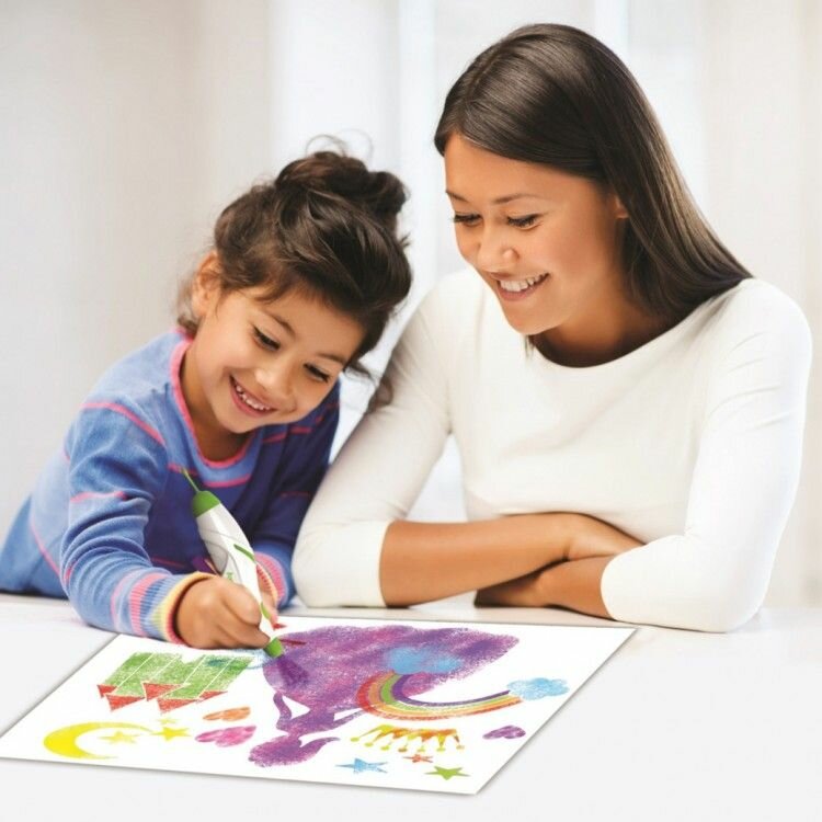 Аэрограф - магический электронный распылитель, который поможет Вашему ребенку отлично провести время. Творите, делайте так много восхитительных рисунков, сколько пожелаете, с помощью электронного маркера и фломастеров ярких цветов! Набор состоит из распылителя со встроенной батареей (500 мАч) , 12 фломастеров с акварельной краской – безопасные нетоксичные чернила, легко отстирывающиеся, подходящие для использования детьми , 6 карточек (132 трафарета с изображением животных, принцесс, фей и единорогов, символы, буквы и цифры), 1 чистящая салфетка, USB-кабель. Время работы распылителя 40 минут.