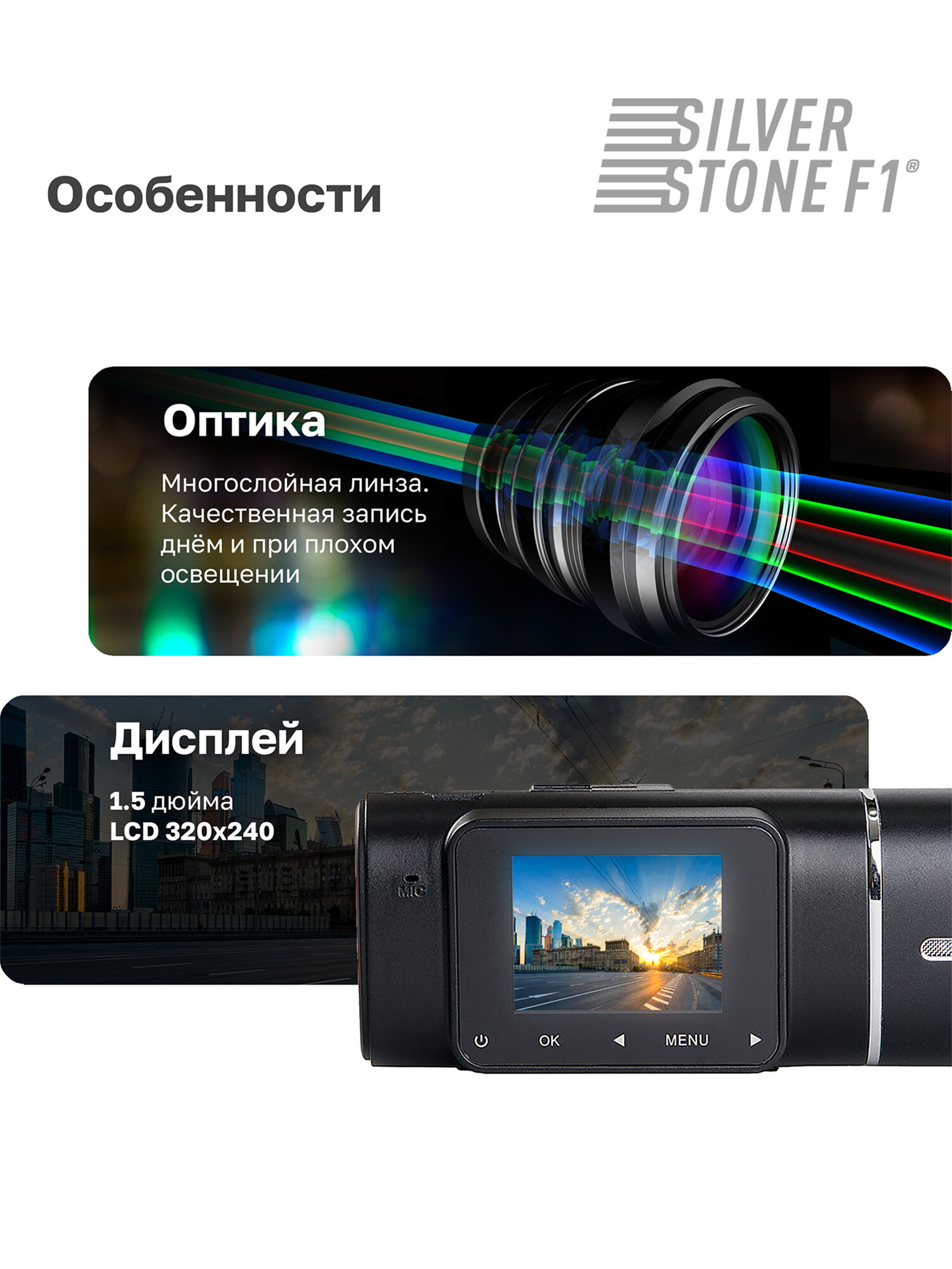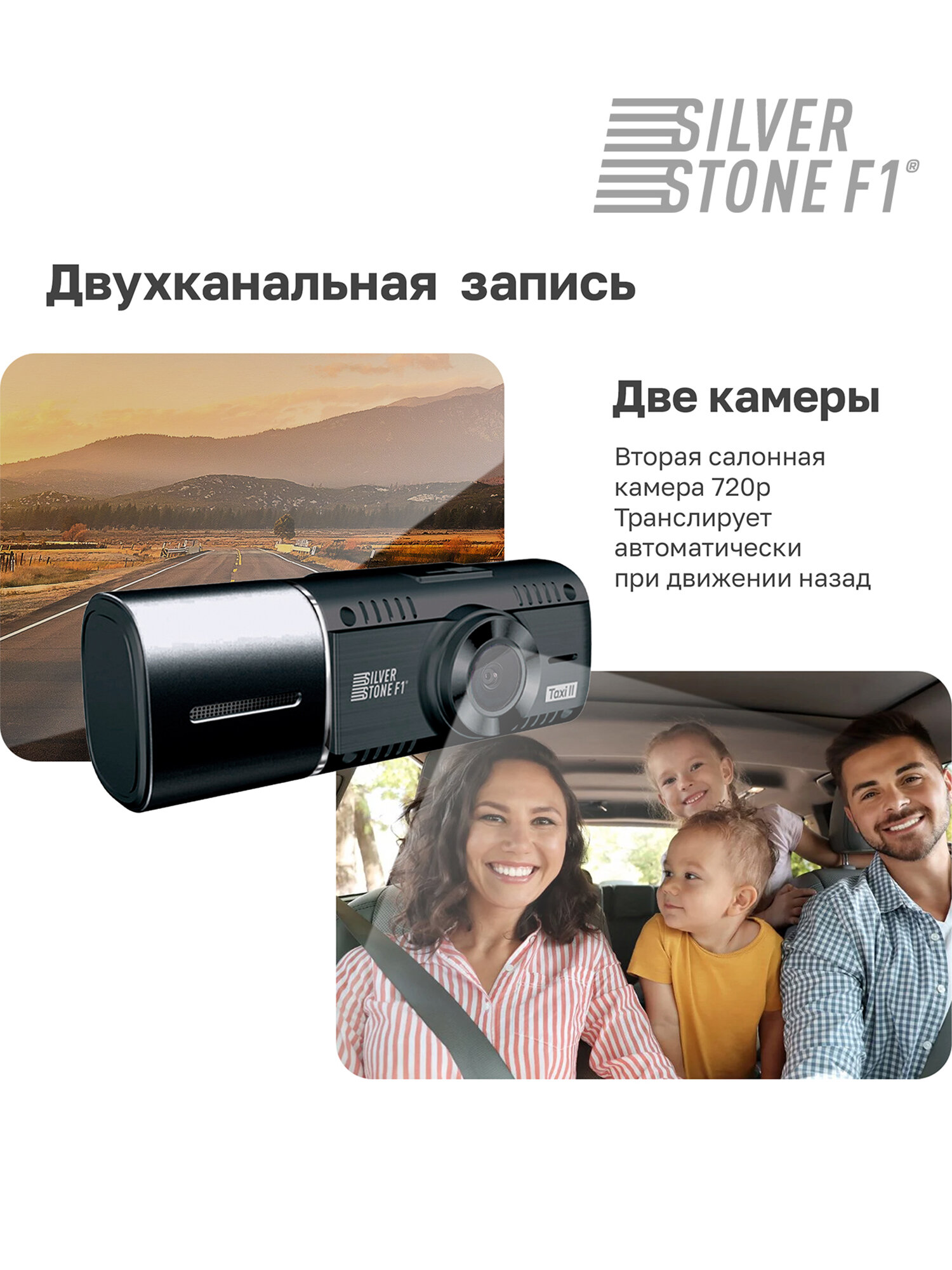 SilverStone F1™ Taxi II (NTK-60F) – видеорегистратор с внутрисалонной камерой 2 в 1: две камеры для съемки дороги и салона автомобиля.