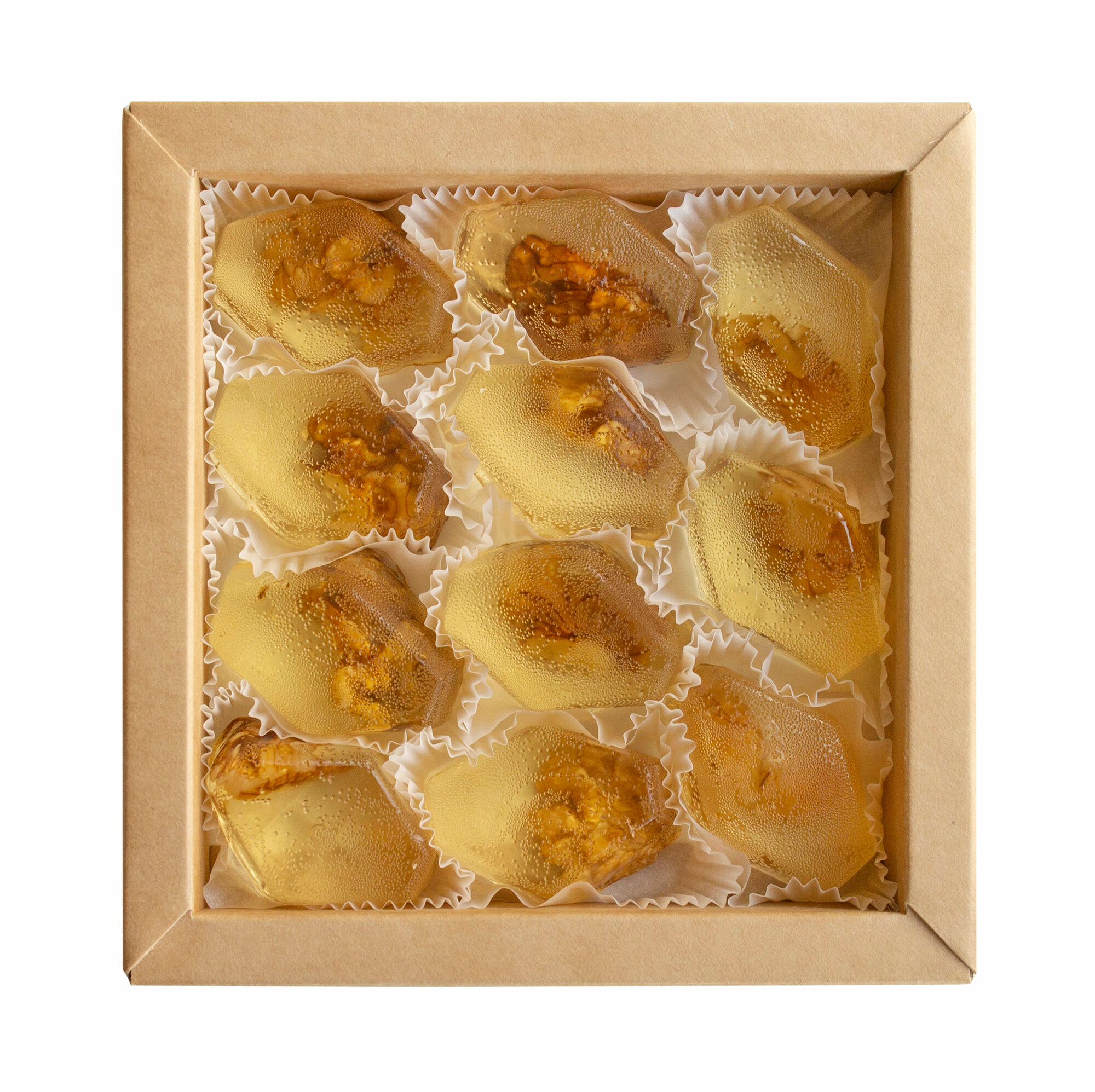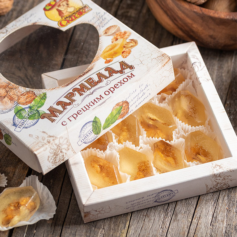 Мармелад с грецким орехом это желейный мармелад, который приготовлен по традиционным рецептам с использованием натуральных ингредиентов. Он станет идеальным дополнением к вашему чаю или кофе, создавая настоящий праздник вкуса. Этот мармелад подходит даже для постного периода. Благодаря этому, его можно рекомендовать не только взрослым, но и детям, включая их перекус в школе. Кроме того, этот мармелад без желатина, с натуральным загустителем - пектином и патокой, что делает его мягче обычного жевательного мармелада и предоставляет возможность наслаждаться этим сладким угощением даже тем, кто предпочитает продукты без желатина. Презентабельная красочная подарочная упаковка придает ему статус сладкого сувенира, который можно дарить как подарок на день рождение, праздники или просто как проявление внимания и заботы к мальчикам, девочкам, учителям, воспитателям или коллегам. Он также идеально подходит для чаепития с коллегами или в качестве гостинца для гостей.