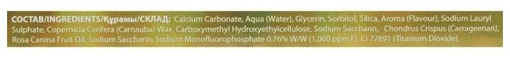 | Состав | карбонат кальция, вода, сорбитол, глицерин, диоксид кремния, ароматизатор, лаурилсульфат натрия, карбоксиметилгидроксиэтилцеллюлоза, карраген, диоксид титана, натриевый сахарин, карнаубский воск, монофторфосфат натрия 0,76% (0,1% от общей массы), масло семян шиповника |