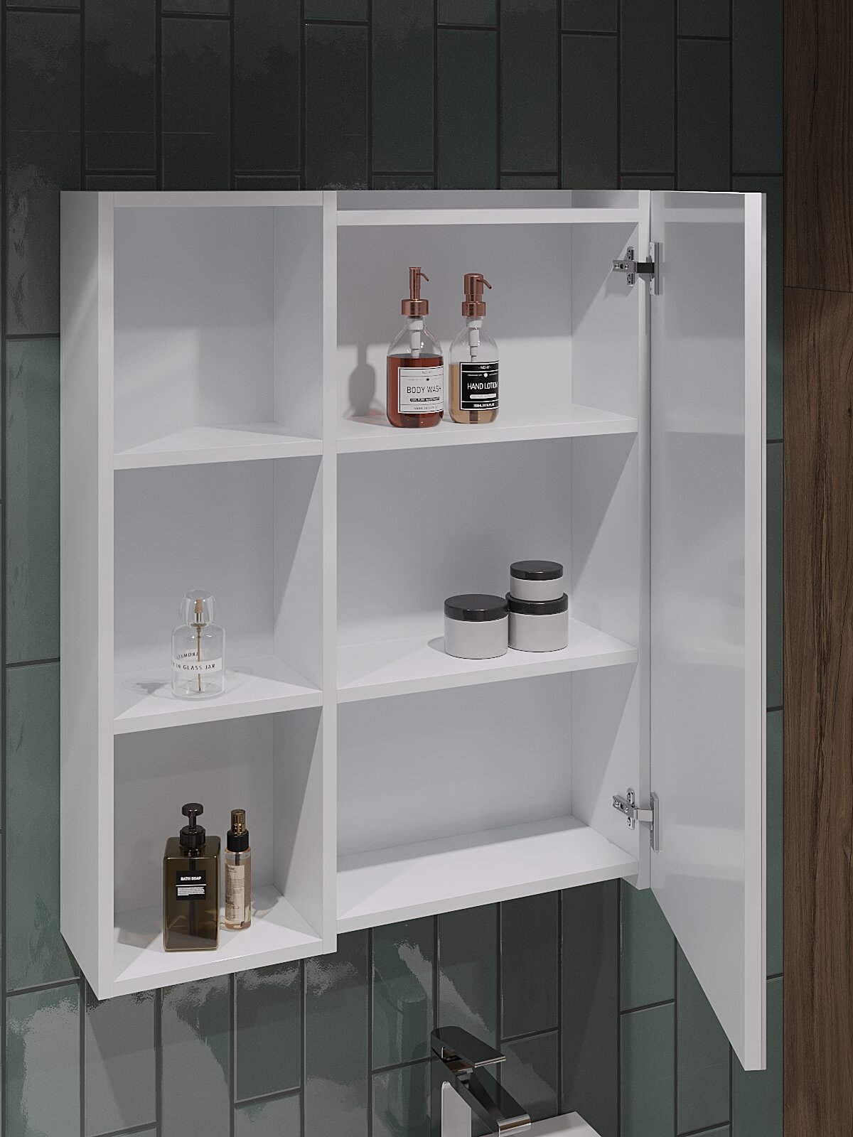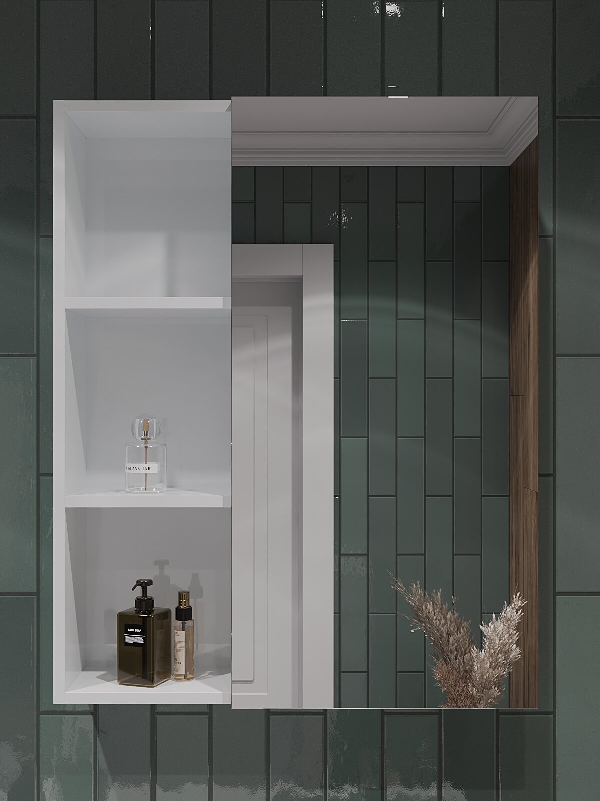Зеркальный шкаф универсальный. Фасад зеркальное полотно, корпус - ЛДСП в цвете матовый белый. Дверца с механизмом доводчика, обеспечивающим плавное закрывание. В комплекте внутренние полочки (ДСП) - 4 шт.