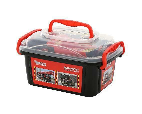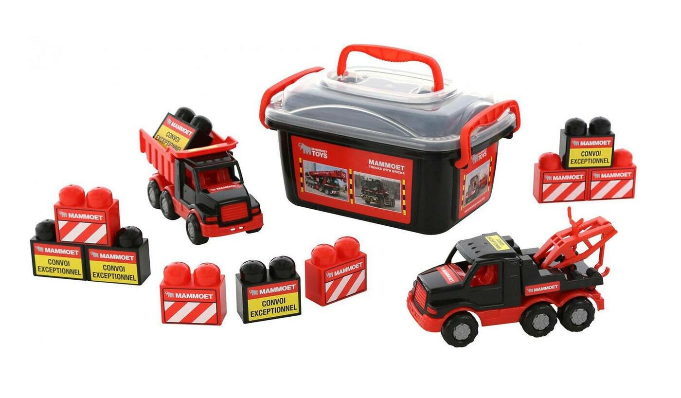 Автомобиль-самосвал Mammoet + автомобиль-эвакуатор + конструктор 10 элементов, Полесье, 57143. Внутри контейнера спрятались сразу несколько реалистичных автомобилей, которые позволят мальчишкам изобразить перевозку песка в кузове самосвала, а эвакуатор пригодится при буксировке сломанных машинок. Особенности: - Дети представят себя водителями самосвала или эвакуатора благодаря детализированным транспортным средствам из этого набора. - Машинки выполнены в виде реалистичных копий техники и в точности повторяют их характерные особенности: откидывающийся кузов и манипулятор с лебедкой. - В качестве груза для самосвала и дорожных ограждений можно использовать яркие детали конструктора с декоративными наклейками. - Благодаря свободно вращающимся колесикам с рельефными покрышками игрушки быстро разгоняются и могут ездить по любой поверхности. - Машинки выполнены из прочного, сертифицированного пластика, они окрашены гипоаллергенными красителями. - Сюжетные развлечения с участием игрушек из набора станут хорошей тренировкой для образного мышления детей и их мелкой моторики, а также сделают досуг интереснее.