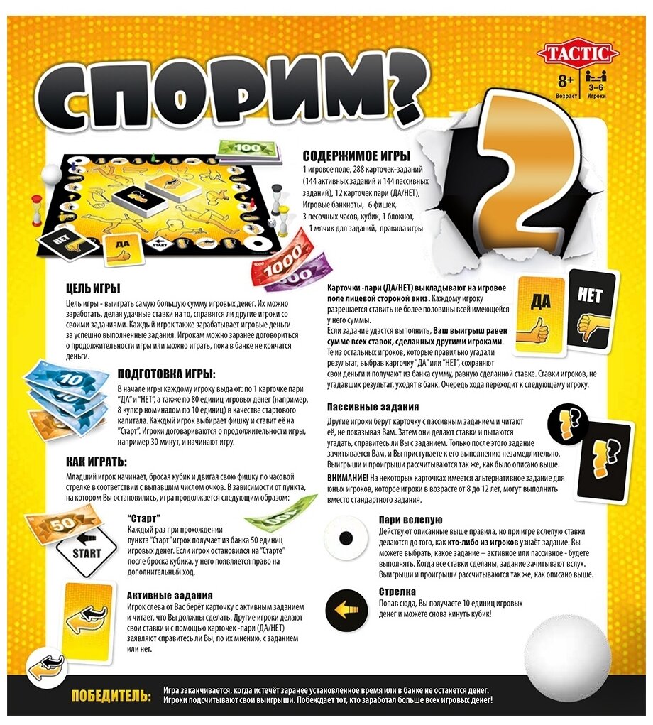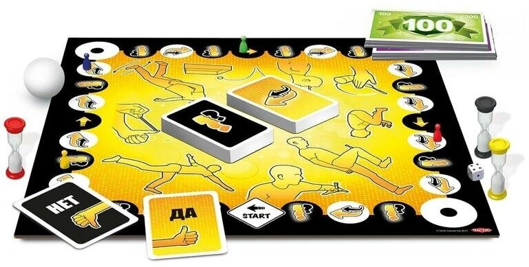 Комплектация: игровое поле, 288 карточек с заданиями, 12 карточек пари, игровые банкноты, 6 фишек, 1 блокнот, 3 песочных часов, 1 кубик, 1 мячик для заданий, правила игры.