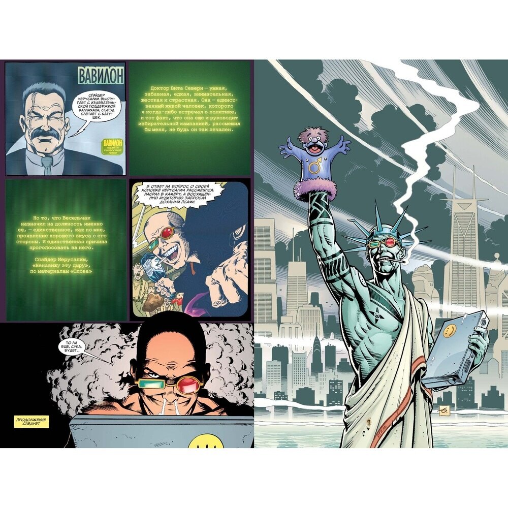 Второй том похождений безбашенного журналиста Спайдера Иерусалима. Собранные в книге выпуски объединены в арку о политической обстановке в Городе. Размышления главного героя о силах, которые противостоят друг другу там, на верху пищевой цепочки общества, циничны, но не лишены истины. И сложность в том, что нужно понять где тут меньшее зло, а где большее.