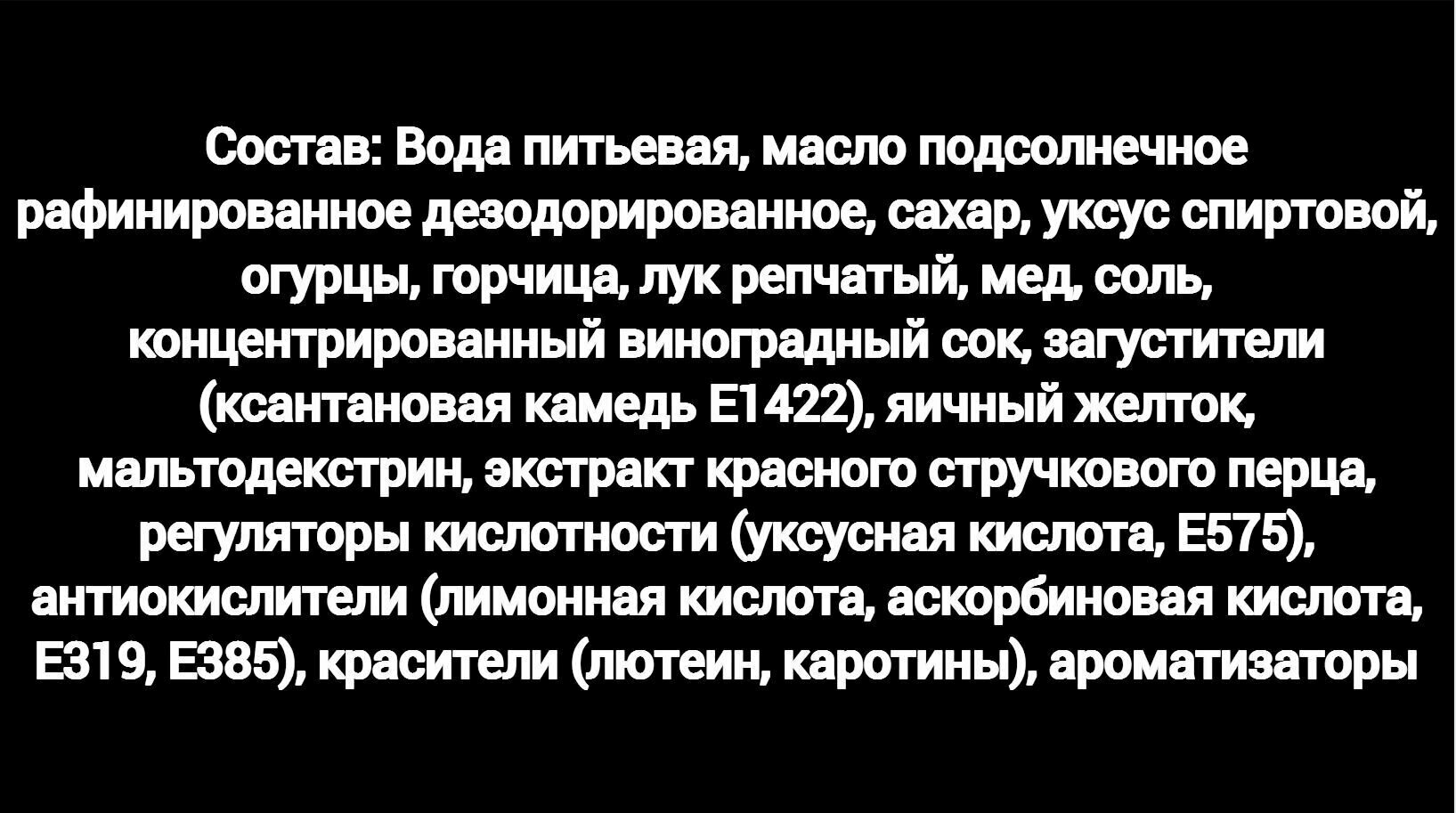 | Состав | вода питьевая, масло подсолнечное рафинированное дезодорированное, сахар, уксус спиртовой, горчица, лук репчатый, мед, соль, концентрированный виноградный сок, загустители (ксантановая камедь Е1422), яичный желток, мальтодекстрин, экстракт красного стручкового перца, регуляторы кислотности (уксусная кислота Е575), антиокислители (лимонная кислота, аскорбиновая кислота, Е319, Е385), красители (лютеин, каротины), ароматизаторы |