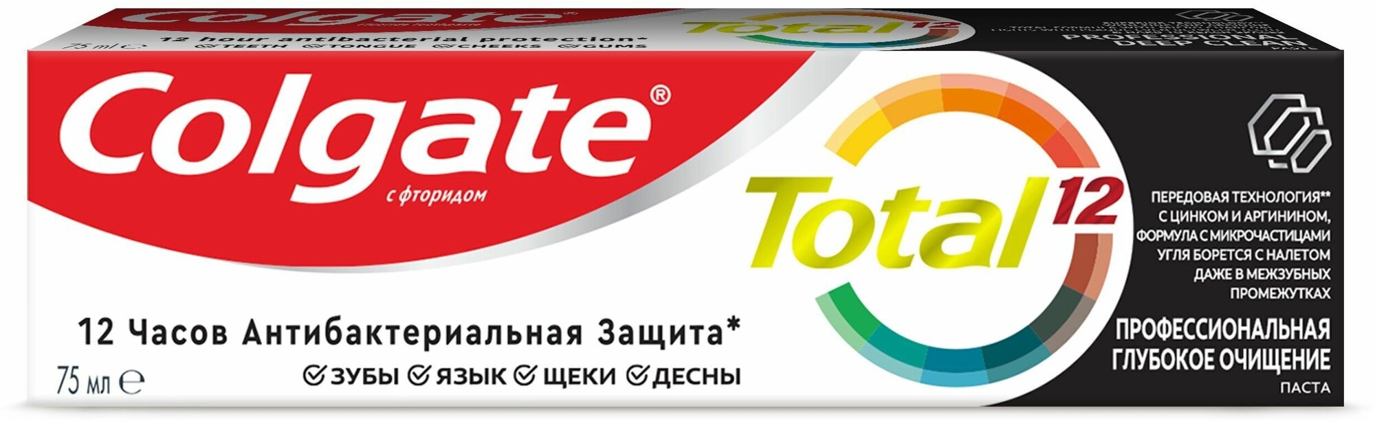 Описание товара:Для обеспечения здоровья всей полости рта необходима комплексная защита, а не только забота о зубах. Поэтому новый Colgate Total 12 Профессиональная Глубокое Очищение проактивно борется с бактериями не только на зубах, но и на языке, щеках и деснах в течение 12 часов*, обеспечивая здоровье всей полости рта. Почувствуйте разницу с уверенной, яркой и здоровой улыбкой! - Защищает зубную эмаль; - Снижает чувствительность; - Борется с бактериями на зубах, языке, щеках и деснах; - Обеспечивает защиту на 12 часов*; - Создает защитный минеральный барьер с цинком и аргинином для всей полости рта; - Мгновенно устраняет неприятный запах; - Оберегает зубы от воздействия кислой среды. *При ежедневном использовании в течение 4 недель.Состав товара:Glycerin, Aqua, Hydrated Silica, Sodium Lauryl Sulfate, Arginine, Aroma, Zinc Oxide, Cellulose Gum, Poloxamer 407, Zinc Citrate, Tetrasodium Pyrophosphate, Xanthan Gum, Benzyl Alcohol, Cocamidopropyl Betaine, Sodium Fluoride, Sodium Saccharin, Phosphoric Acid, Mica, Sucralose, Eugenol, CI 74160, CI 74260, CI 77492, CI 77891.Меры предосторожности:Не глотать.Способ применения:Небольшое количество пасты нанести на зубную щетку. Чистить зубы в течение 2х минут, после чего ополоснуть рот водой. Полезно для природы, полезно для тебя! Не забывай чистить зубы дважды в день и менять зубную щетку каждые 3 месяца.