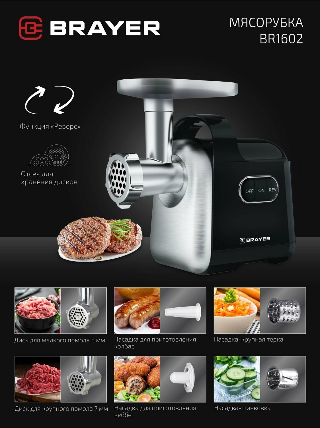 | Прочие особенности и свойства | Функция «Реверс», 2 диска из нержавеющей стали для крупного и мелкого помола (5 мм. и 7 мм.), Толкатель для продуктов, Отсек для хранения дисков, Металлический лоток, Защита от перегрева, Защита двигателя от перегрузки |