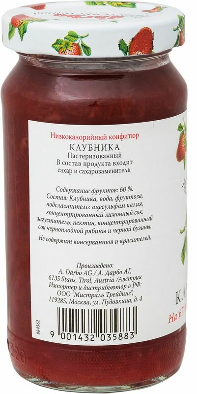 Конфитюр Darbo клубника - это низкокалорийное лакомство с повышенным содержанием фруктов (60%). Вместо сахара используется фруктоза. Полезные вещества, содержащиеся в клубнике, способствуют выведению пестицидов и радионуклидов из организма, а также повышают тонус сердечно-сосудистой системы. Продукт является низкокалорийным. Не содержит консервантов и красителей.