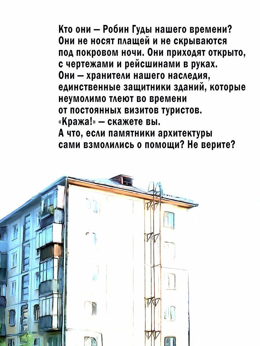 Кто они — Робин Гуды нашего времени? Они не носят плащей и не скрываются под покровом ночи. Они приходят открыто, с чертежами и рейсшинами в руках. Они — хранители нашего наследия, единственные защитники зданий, которые неумолимо тлеют во времени от постоянных визитов туристов. «Кража!» — скажете вы. А что, если памятники архитектуры сами взмолились о помощи? Не верите? Приходите и узнайте, сколько подлинников скрывается в городе Украденных улиц.